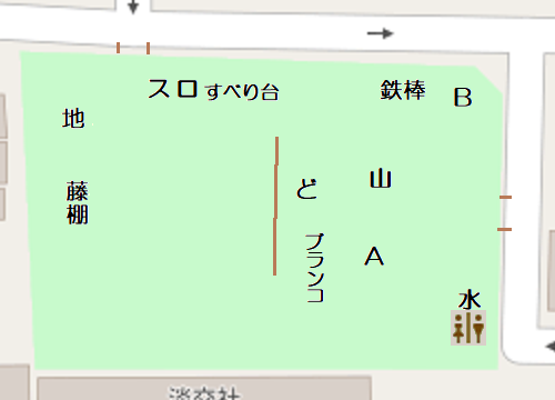 2025年11月現在の配置 すべり台(金属製) ブランコ(2連) 鉄棒(2連) 山…山型遊具 ※山型遊具に隣接した砂場あり ス…スプリング遊具(ウマ) ロ…ロッキング遊具(飛行機) ど…動物の象形遊具(ゾウ) A…レーシングカー型遊具 B…古いベンチ 藤棚 地…地蔵堂 水…手洗い場 |