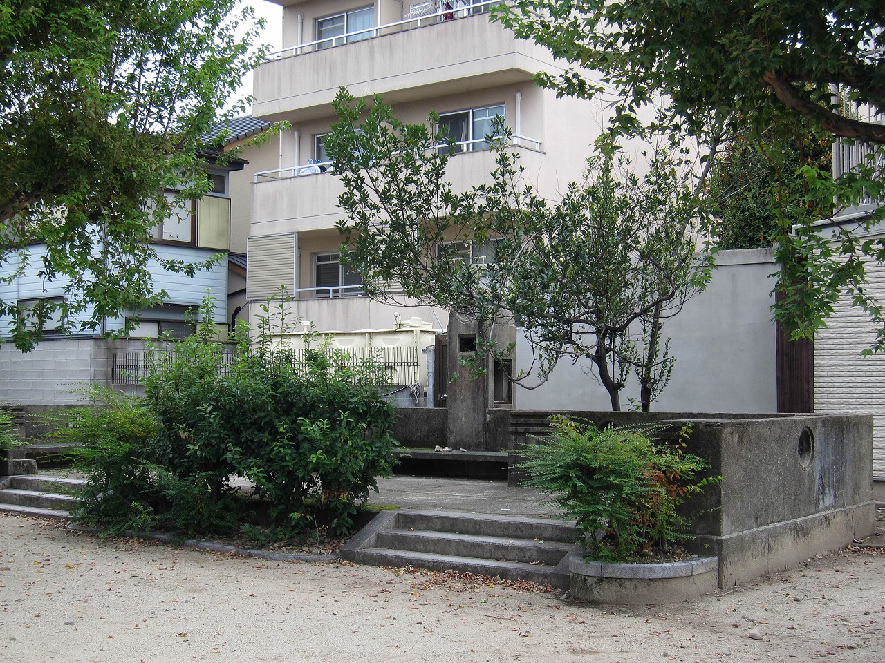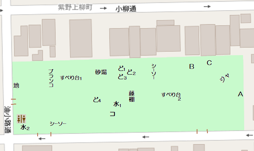 2025年11月現在の配置 すべり台1(金属製) すべり台2(コンクリート製・幅広・小) シーソー×2 ブランコ(2連) ジャ…ジャングルジム ※ジャングルジムに隣接した砂場あり ど1…動物の象形遊具(半球型・カメ) ど2…動物の象形遊具(半球型・ゾウ) ど3…動物の象形遊具(半球型・ウサギ) ど4…動物の象形遊具(カバ) コ…コンクリート製遊具(トンネル) A…ラジオ塔 B…石碑「区画整理之碑」 C…石碑「池田新兵衛・舩越嘉右衛門顕彰碑」 砂場 藤棚 地…地蔵堂 水1…水栓柱 水2…手洗い場 |