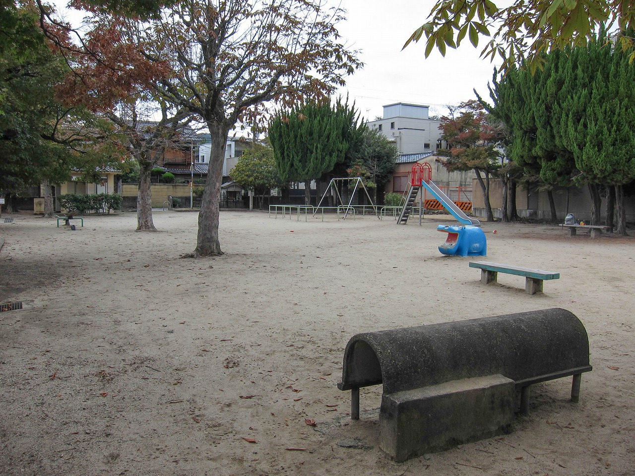 北大路通と堀川通の交差点から北東約400mに位置し、紫野宮西公園と並んで北区最古の公園です。東西に細長く、古い遊具や遺構が残る、土木学会選奨の「戦前竣工の京都市児童公園群」13公園のひとつです。この細長さもあってか、憩い、遊び、歴史を味わうなど、移動することで公園の様々な面が垣間見えます。 コンクリート製のトンネル遊具は古いものと思われ、姉坊城公園、春栄公園、六条院公園にも現存します。ジャングルジムは細いすべり台が出ており全体としてゾウのような形をしていますが、これも今は希少で、撤去される例が相次ぐ中で他には中ノ坪公園には現存しているようです。半球型の象形遊具(カメ、ゾウ、ウサギ)は岩倉南公園にもいます。 京都にはいくつかのラジオ塔が現存しますが、ここのは塔自体は小さいものの、ベンチ状の大きな構造物を含めて残されているのが特徴です。2つの石碑は区画整理に関するものらしく、約100年前、この公園ができる直前のこの地域の歴史を伝えています。 藤棚の西にはかつてちびっこプール(1973年度開設)がありましたが2007年頃までに撤去され、その跡に象形遊具(カバ)、スプリング遊具(カメとオートバイ)が置かれました。その後カメは2016~2017年頃に、オートバイは2018~2019年頃になくなっています。すべり台(小)の北には枠だけの遊具(中堂寺公園などと同じもの)がありましたが、2015~2016年頃に撤去されました。高い方のすべり台としては西のシーソーの東隣にコンクリート製のものがありましたが、2023~2024年頃にブランコの東隣に移って金属製に代わりました。