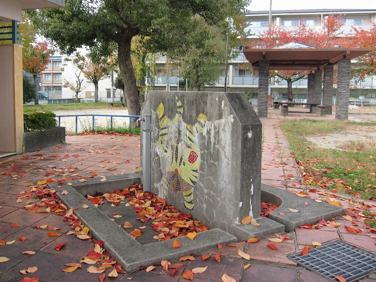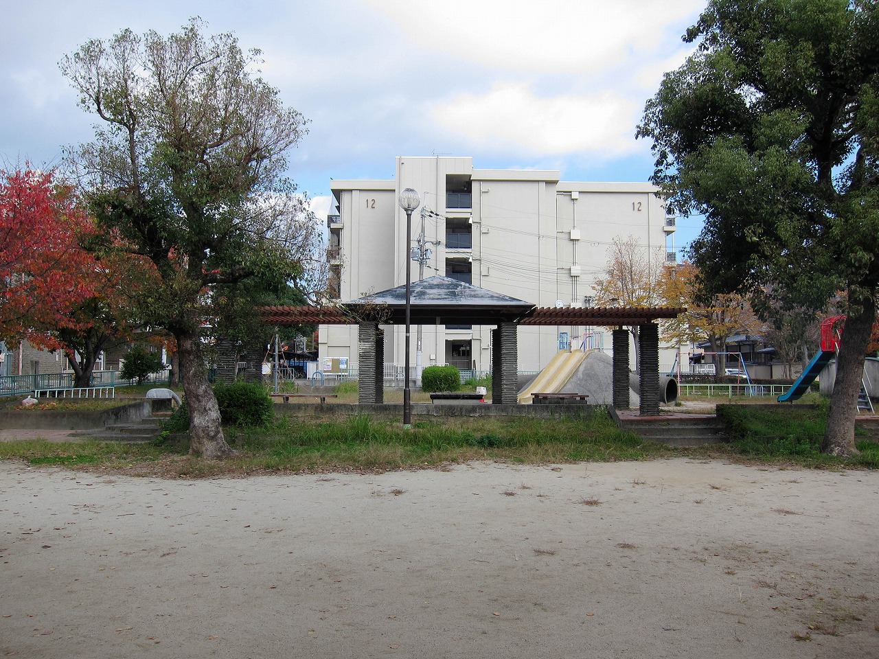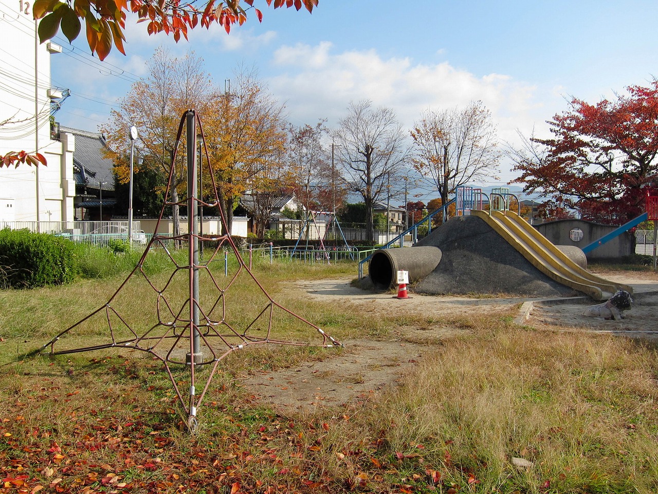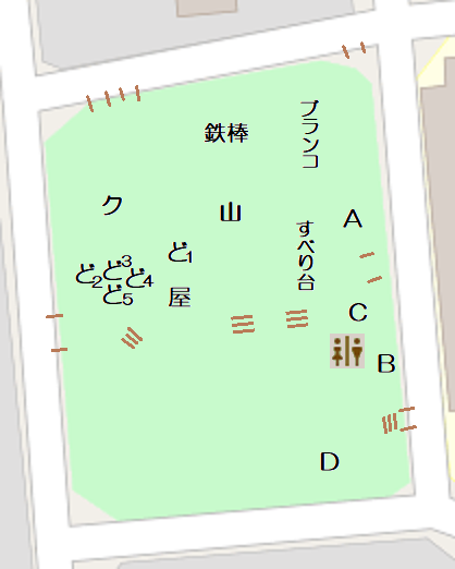 2025年11月現在の配置 すべり台(金属製) ブランコ(2連) 鉄棒(3連) 山…山型遊具 ※山型遊具に隣接した砂場あり ク…クライミング遊具(ザイル型) ど1…動物の象形遊具(親子ライオン) ※親子ライオンは、山型遊具に隣接した砂場の中 ど2…動物の象形遊具(ブタ) ど3…動物の象形遊具(ライオン) ど4…動物の象形遊具(ウサギ) ど5…動物の象形遊具(ゾウ) A…壁アート B…壁アート C…壁アート(トラの絵・両側に水栓柱あり) D…石碑「全国水平社創立記念碑」 屋…屋根付き休憩所 |