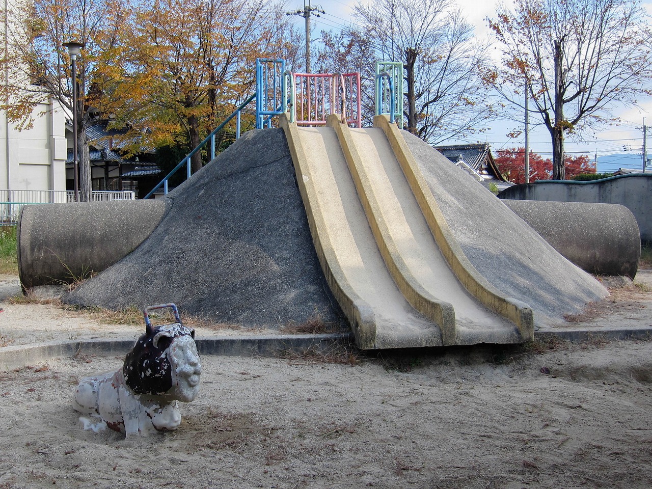 京都市の資料では1951年設置となっていますが、現在の公園は1975~82年頃に移転された、比較的新しい公園です。1960年代には現在より北西の、紫野花ノ坊町と鷹峯旧土居町にまたがった場所(現在の「楽只館」を含む)で南北に長めの公園でした。(なお、その楽只館付近の西側の石垣には後から補修された部分があり、旧公園につながる階段だった可能性があります。)それが1970年代には建物が建てられていって公園ではなくなり、南東の現在地(紫野北花ノ坊町)では1982年頃までに新しい楽只公園として整備されました。 クライミング遊具はおそらく2007~2008年頃に設置されました。石碑の設置は2022~2023年頃で、別の場所から移されてきたものです。すべり台は、コンクリート製だったのが2022~2025年の間に金属製に代わりました。他の多くの遊具は、公園移転後からずっとあるものと思われます。 象形遊具は個性的な5体の動物です。抽象的な形のゾウは三条坊町公園や壬生檜公園にもおり、岩倉中町公園には同じゾウもライオンもいます。ブタは小さい子も乗れる低さで、角ばったウサギは2本の足で立っています。 少し離れた砂場には親子ライオンがいます。頭に取っ手がついており、下に隠れた子ライオンとともに砂場を見守っています。しかし公園内の掲示によると、この親子ライオンと山型遊具と鉄棒はまもなく撤去され、2026年3月までに新しい複合遊具と鉄棒が設置されるとのこと。公園東隣の建物も今は無くなって広範囲で更地になっており、今後はまただいぶ違った景色になっていきそうです。 ![]()