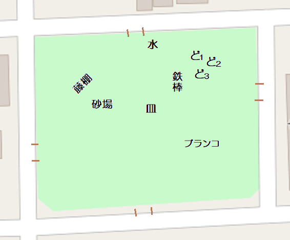 2025年10月現在の配置 ブランコ(2連) 鉄棒(2連) 皿…皿型遊具 ど1…動物の象形遊具(ペンギン) ど2…動物の象形遊具(ウサギ) ど3…動物の象形遊具(アシカ?) 砂場 藤棚 水…水栓柱 |