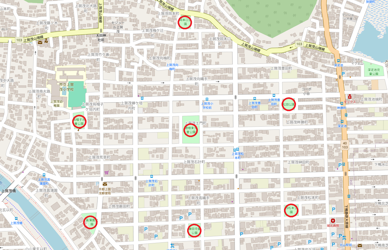 京都市発行の公園関係資料、住宅地図、国土地理院地図・空中写真 OpenStreetMap、Google ストリートビュー、Google Earth フィールド・ミュージアム京都(2003年) 発祥の地コレクション(2007年) こどもちず(2021年) |