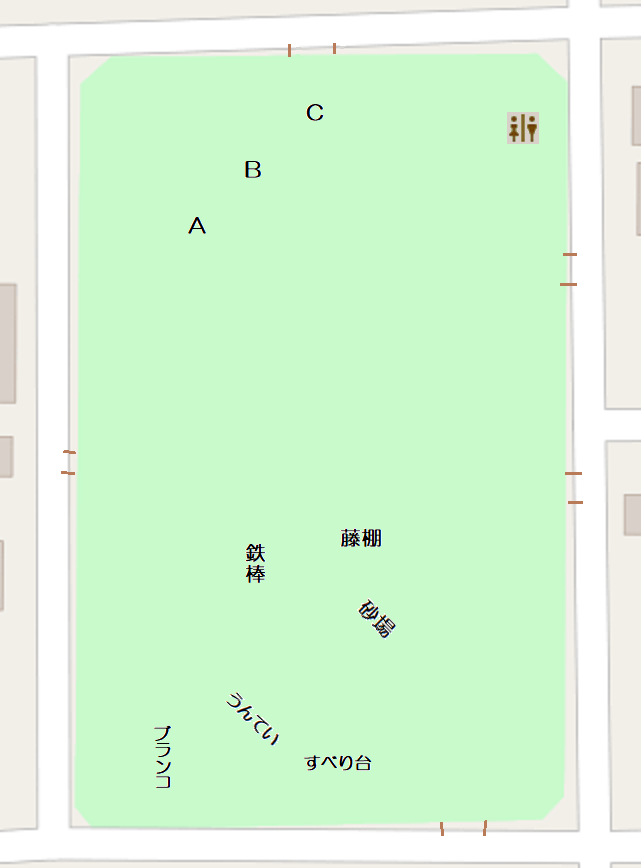 2025年10月現在の配置 すべり台(金属製) ブランコ(2連) 鉄棒(2連) うんてい(傾斜型) A…石碑「完成記念」 B…石碑「すぐき発祥の地」 C…石碑「記念の森」 砂場 藤棚 |