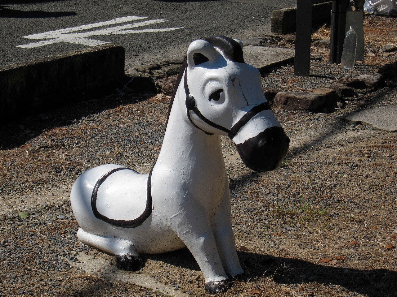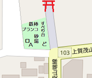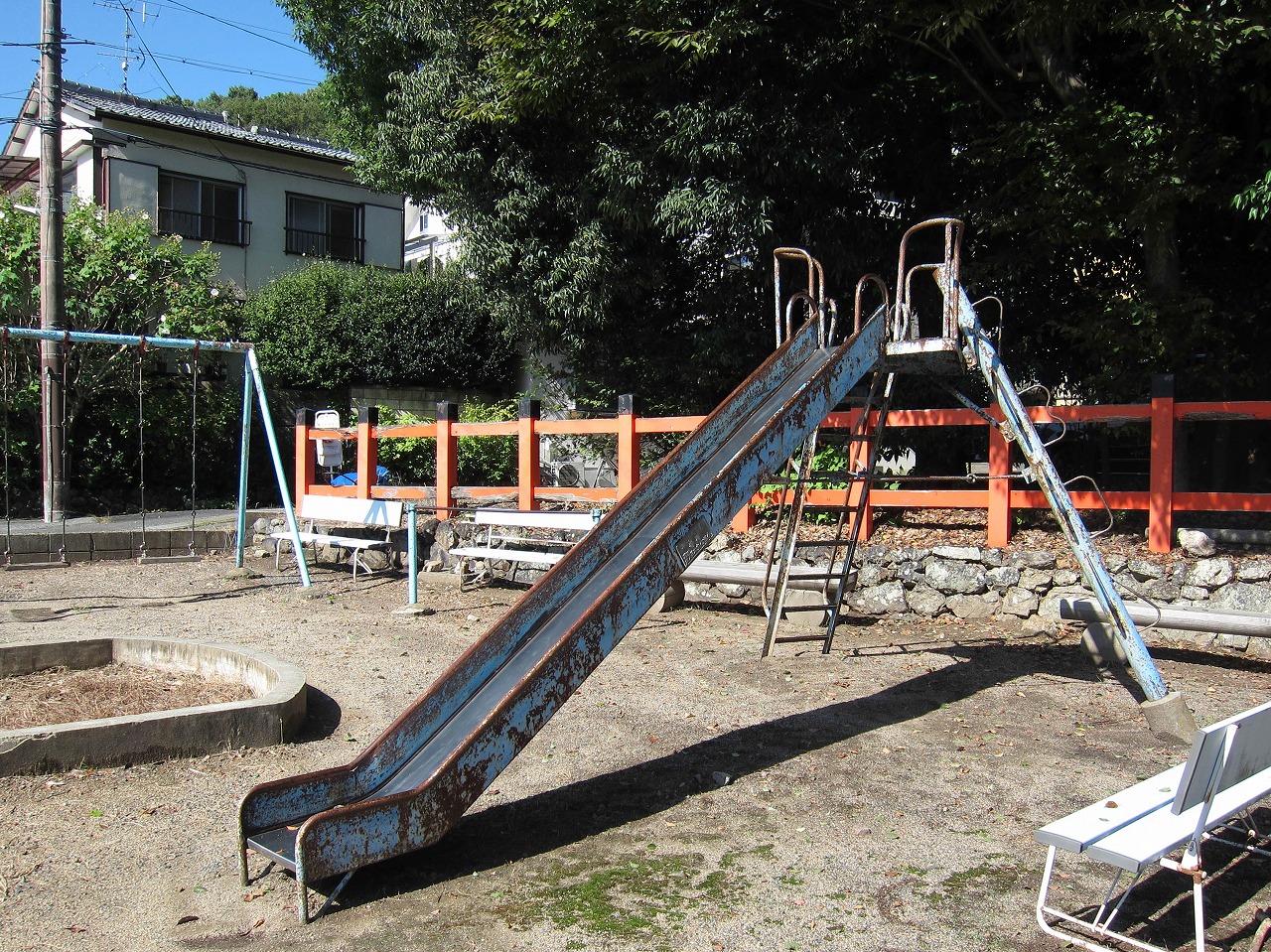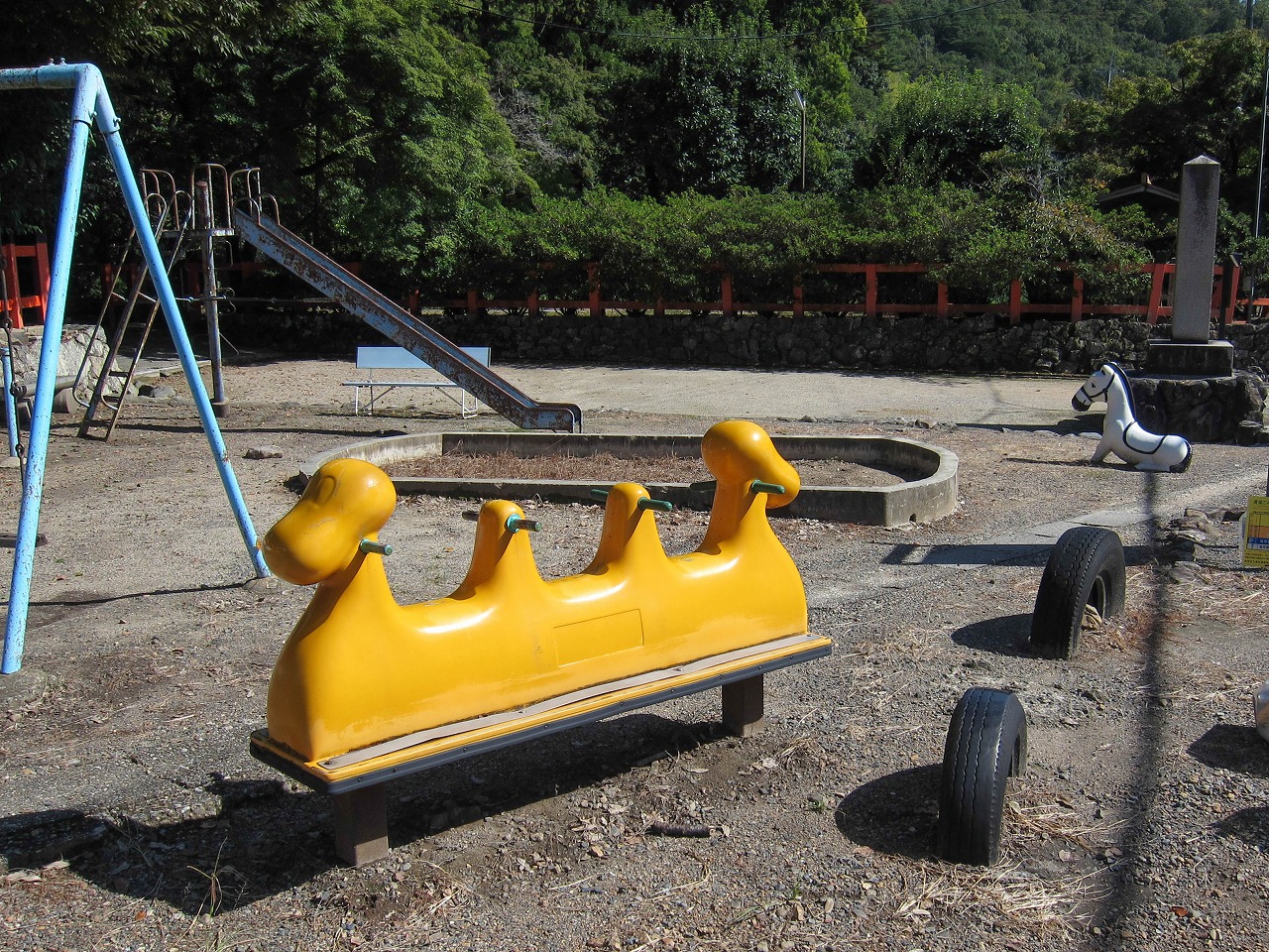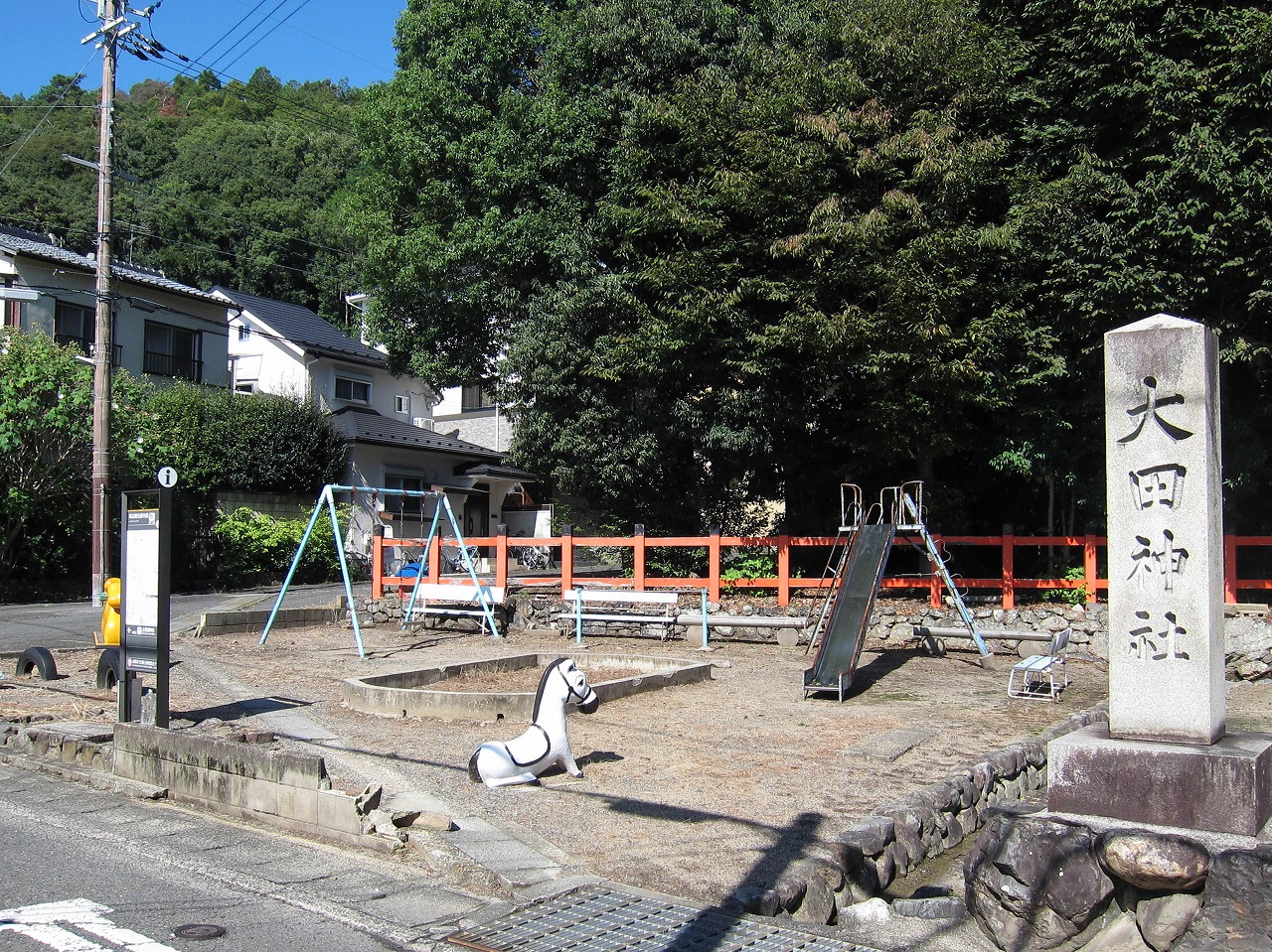 カキツバタで有名な大田神社の参道脇にある、児童公園的なスペースです。設置時期は不明ですが、1980年代には既に公園として使われているようです。 すぐ道路に面しているので落ち着いてゆっくり休憩するには不向きかもしれませんが、狭い敷地に遊具が密集しているため、小さい子にとっては効率よく様々な遊具に触れられるでしょう。幅の狭いすべり台、横に長い鉄棒、3人乗りタイプのロッキング遊具などは、京都市が管理する通常の公園にはあまり無いもので、また違った味わいがあります。 ![]() 白馬の尻尾やたてがみなどは過去は茶色でしたが、2017年頃に黒色に塗り直され、白色部分も綺麗になっています。