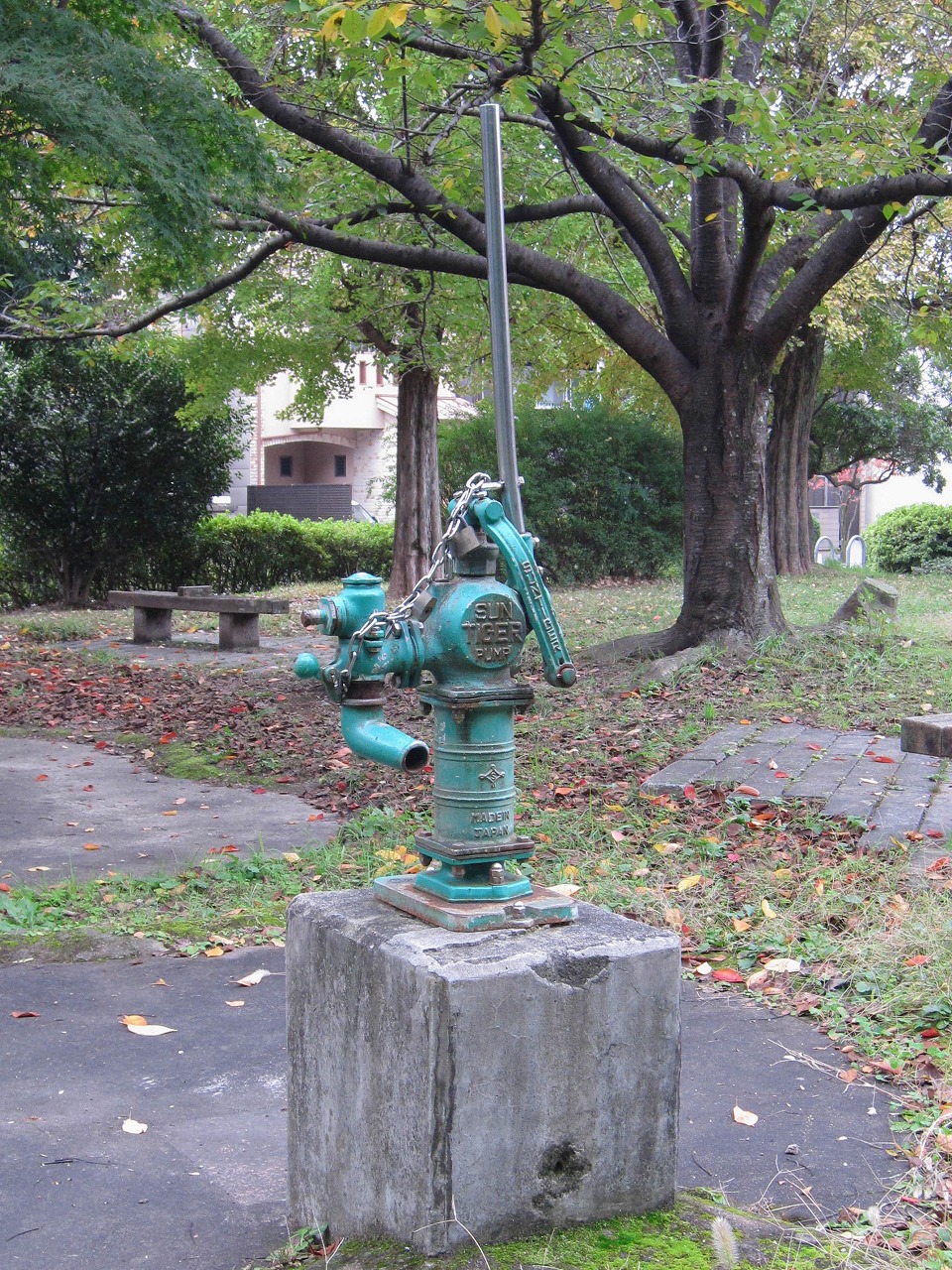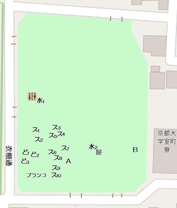 2025年11月現在の配置 ブランコ(2連) ス1…スプリング遊具(オートバイ) ス2…スプリング遊具(サイドカー付きオートバイ) ス3…スプリング遊具(ウサギ(黄)) ス4…スプリング遊具(ウサギ(白)) ス5…スプリング遊具(カメ) ス6…スプリング遊具(ウマ(黄)) ス7…スプリング遊具(ウマ(黄)) ス8…スプリング遊具(ウマ(濃い黄)) ス9…スプリング遊具(ゾウ) ス10…スプリング遊具(ドラゴン) ど1…動物の象形遊具(ゾウ) ど2…動物の象形遊具(カメ) ど3…動物の象形遊具(イヌ) A…複合遊具(すべり台等) B…ポンプ 屋…屋根付き休憩所 水1…手足洗い場 水2…手洗い場 |