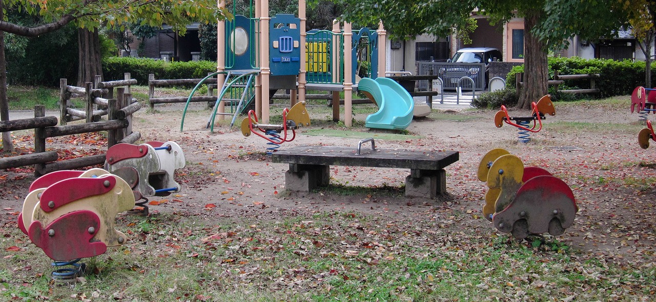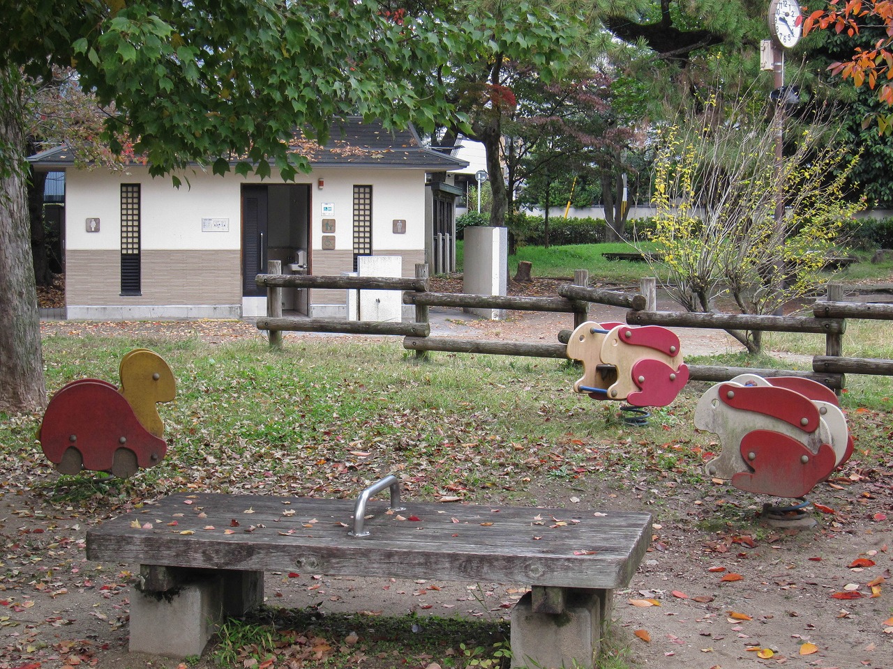 衣棚通沿いの、鞍馬口通を下がったところにある広い公園です。いわゆる四神(青龍、白虎、朱雀、玄武)の名がつく京都の公園は、おそらくこの玄武公園と朱雀公園だけです。北は憩いの場としての森、中央は自由に遊べる広場、南西は小さい子ども向けの遊具が豊富、とバランスがとれています。一方、ジャングルジムなど大きめの子ども向けの遊具や、近年増えている大人向けの健康遊具は見当たりません。 スプリング遊具の多さが目を引きます。合計10体、これほど多い場所は他にあるのでしょうか。耐久性の問題で近年はロッキング遊具に置き換わる例が多い中、これほどたくさんのスプリング遊具で遊べるところは、将来的にももうあまり出てこないように思えます。その点で現在の玄武公園のこのエリアは大変貴重です。 ![]() ![]() 象形遊具では玄武の名がつく公園にふさわしい立派なカメや、珍しい伏せた犬もいます。ゾウは岩倉南公園のゾウに似ていますが若干形が違うようです。 この公園はかつて北の3分の1ほどのスペースに、大きな25mサイズのプール(1942年開設)がありました。また、南西にはちびっこプール(1973年度開設)もありました。それらが2003~2005年頃に撤去されて大規模な改修が行われ、現在のような姿になっています。スプリング遊具や総合遊具はその頃からのもので、そのうちオートバイ型の2つには2003との表記がありました(製造年を示すものかもしれません)。