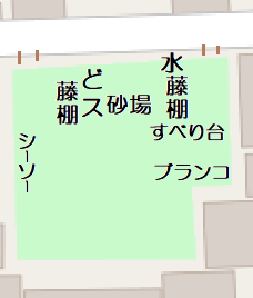 2025年11月現在の配置 すべり台(コンクリート製) シーソー ブランコ(2連) ス…スプリング遊具(ゾウ) ど…動物の象形遊具(シカ) 砂場 藤棚×2 水…水栓柱 |
