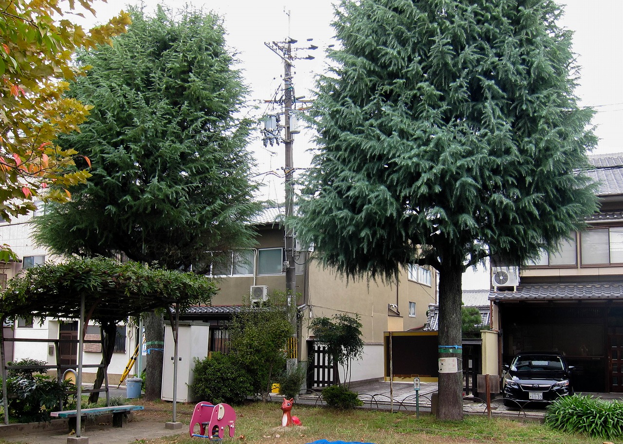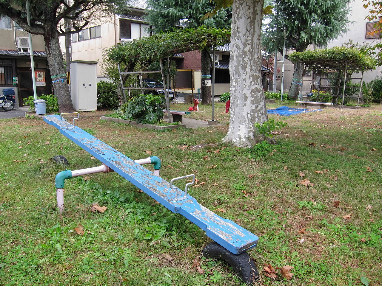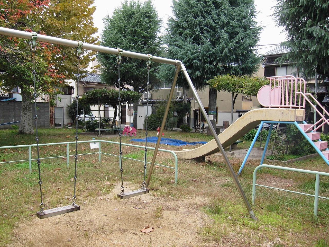 住宅街の中の小さな公園です。向かいあった小さい藤棚が2つ、小さめのすべり台の他、ブランコなどの基本的な遊具も揃っています。 シカは象形遊具として小さめのサイズで、その大きさも、背中に布が置かれたようなデザインも姉坊城公園のリスと共通しています。ゾウは近くの玄武公園の他、西の京公園などでも見かけます。 砂場は以前はもう少し大きいサイズでしたが、2009~2013年の間に小さくなりました。その分の空いたスペースに、2013年までにゾウが、2013~2015年の間にシカが置かれています。ブランコの西にはタイヤ遊具(タイヤが2つ地面に埋め込まれていた)がありましたが、2013~2015年の間になくなりました。 北側に大きなヒマラヤスギが3本ありますが、この3本を伐採し、新たにサルスベリ1本を植えるという計画が公園内に掲示されていました。検討段階と書いてあったので確定ではないかもしれませんが、工事予定は2025年12月から翌年1月とのことです。京都の公園は数十年前と比べ、木がだいぶ減ったような印象を受けます。特にヒマラヤスギは倒木の危険があるということで、優先的に伐採されているのでしょうか。ヒマラヤスギに囲まれた20世紀的な京都の公園の景色は、徐々に消えていく運命なのかもしれません。 ![]()
