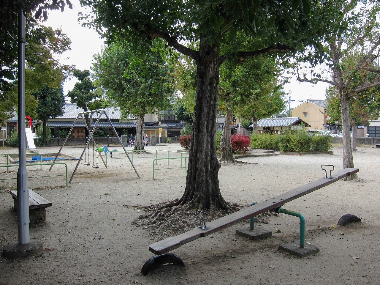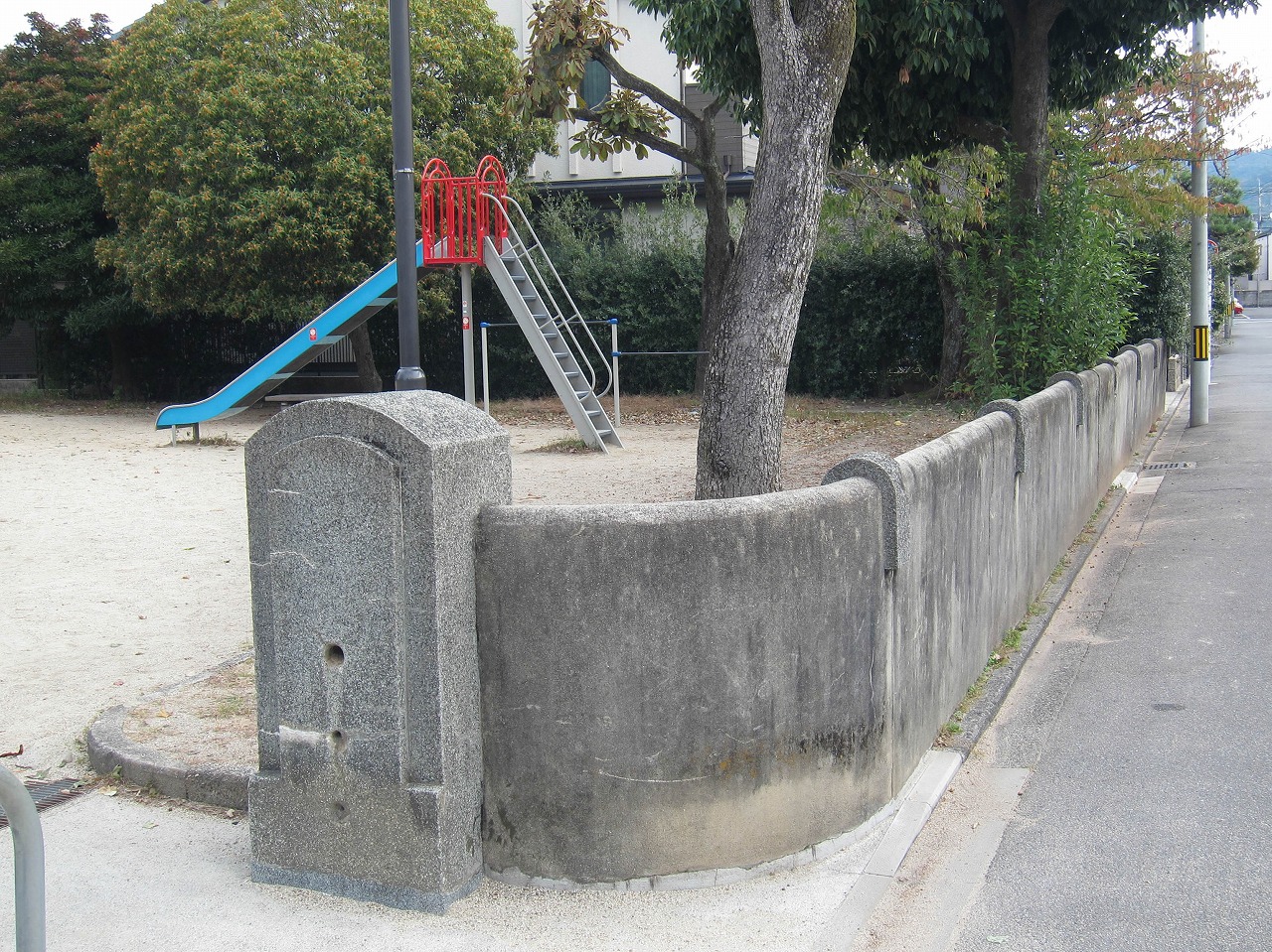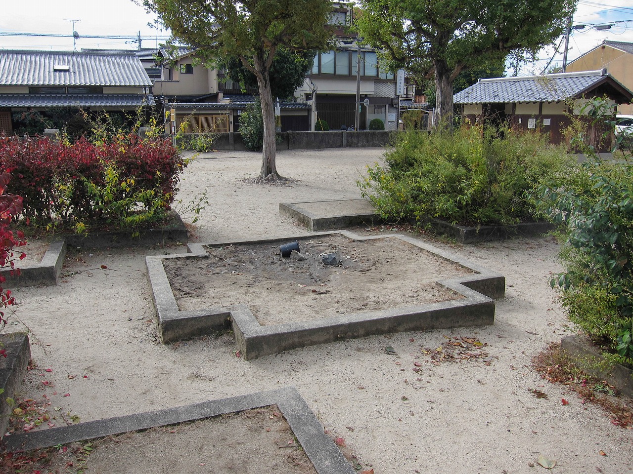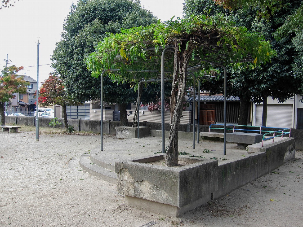 下鴨膳部公園と並び、街区公園では左京区で最も古い公園です。このあたりをジグザグに通っている松ヶ崎通はこの公園の西と北で接しています。 コンクリートの壁が周りを囲っており、藤棚や中央の植え込みエリアと合わせて、グレーに覆われた重厚な空間をつくっています。1989年の資料によると藤棚、シーソー、ブランコ、砂場といった主な配置は1958年から現在の2025年まで変わっていないようなので(遊具自体は代わっているかもしれませんが)、70年近く、あるいはもっと長い間、この公園は同じ雰囲気を保存し続けてきたのかもしれません。 この10年ほどで少しずつ変化した部分もあります。クジラの横にいたのは2016年頃まではスプリング遊具のラッコでした(この組み合わせは菖蒲園公園や三条坊町公園などでもみられます)が、2018年頃までにロッキング遊具のサイに代わりました。トイレは2020~2021年の間に新しくなりました。すべり台はコンクリート製だったのが2022~2024年に金属製に代わり、それに伴って鉄棒も少し位置を変えて新しくなりました。