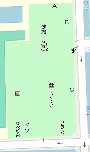 2025年11月現在の配置 すべり台(金属製) シーソー ブランコ(2連) うんてい(ツイスト型) ど1…動物の象形遊具(シマウマ) ど2…動物の象形遊具(ハト?) 健…健康遊具(ぶら下がり器) A…三角点 B…石碑「記念」 C…掲揚台 砂場 屋…屋根付き休憩所 水…水栓柱 |