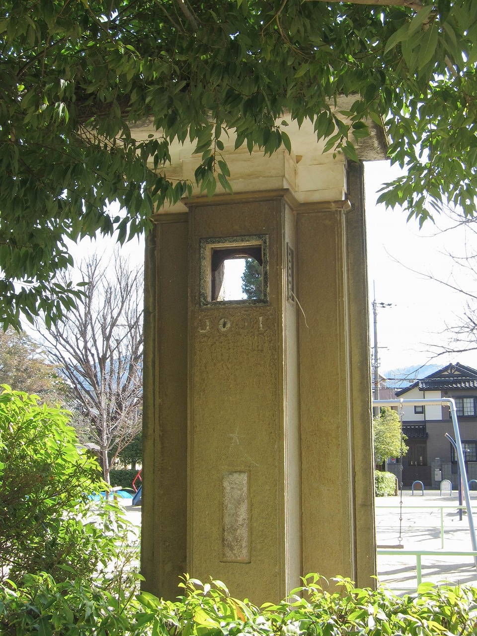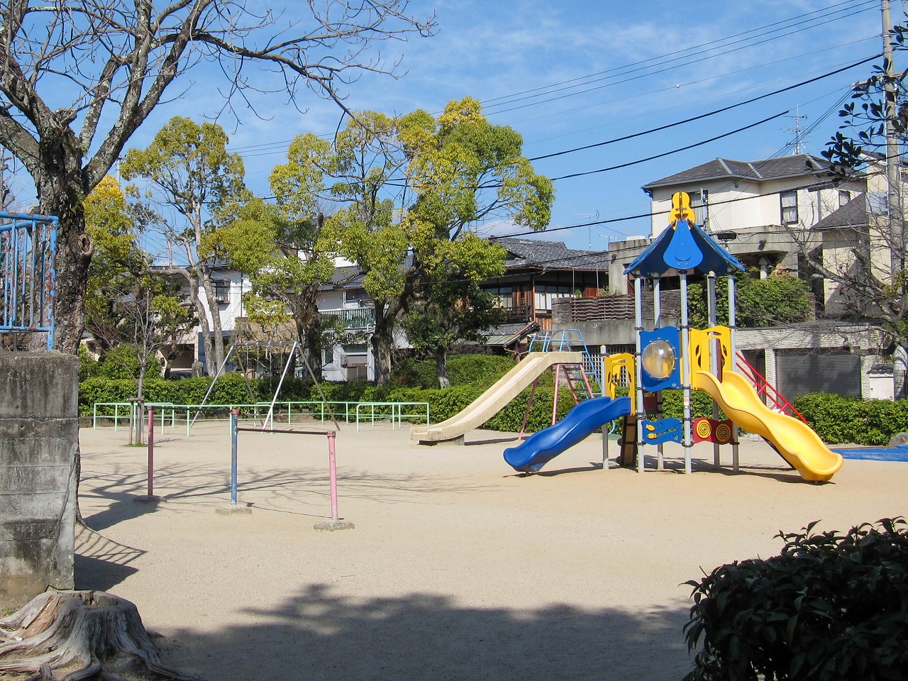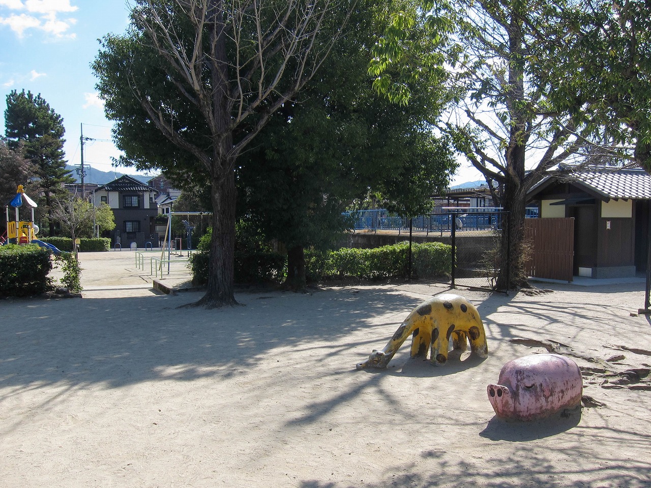 府立植物園の東に位置し、土木学会が選奨した京都の「土木遺産」13公園のひとつでもある古い公園です。広い敷地は樹木やフェンスなどで概ね4つのエリアに区切られています。 北東は最も遊具が集まっているエリアで、カラフルな複合遊具が目を引きます。北西は少しの遊具と広場、南西はほぼ広場になっています。南東にはかつてプールがありましたが、1980年代には既に現在のような高台に屋根付き休憩所という形になっているようです。 竣工記念碑は1934年付で、洛北地区の土地区画整理に関するものです。この記念碑と掲揚台は、近年は生け垣に囲まれて近づきにくくなりました。他にもラジオ塔(1941年付)、コンクリート製ベンチなど、かなり古いものが多く残っています。 キリンとブタの組み合わせは壬生檜公園や養正市営住宅13棟でも見られ、形もほぼ同じです。しかしそれぞれに個性はあるもので、キリンは模様が違っていたり、ブタの場合は尻尾の形が様々だったりします。左から順に萩公園、壬生檜公園、養正市営住宅13棟のブタの尻尾です。 ![]() キリンは2014~2016年の間に塗り替えられて以来、現在の網目模様になっています。2連ブランコはかつて3つありましたが、2018~2020年の間に新しいものに入れ替わり現在のように2つになりました。健康遊具は2018年頃、複合遊具は2021年に新設、トイレは2025年頃に新しいものに建て替わっています。