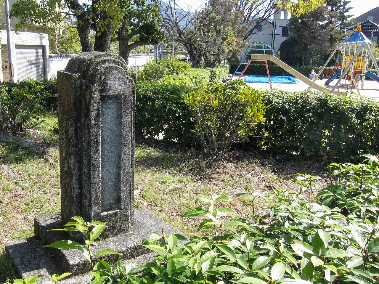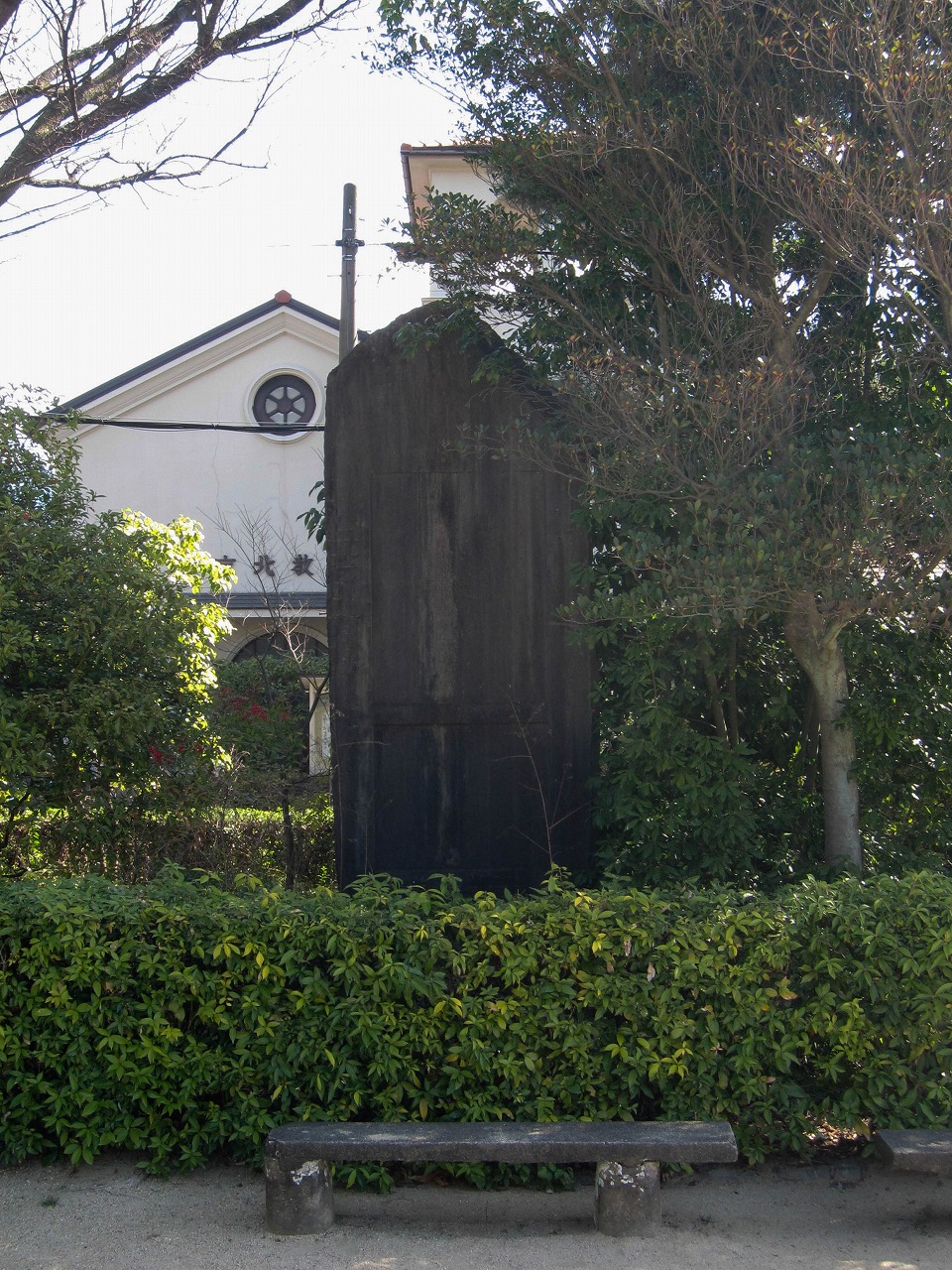 ![]() (2026年3月) 石碑「竣工記念碑」の裏側 左奥は京北教会 東の方向 |