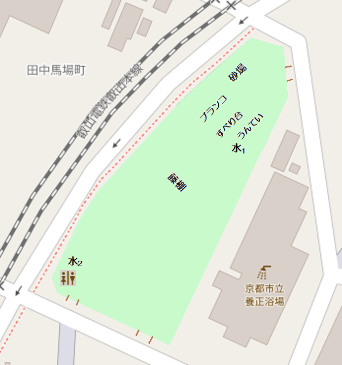 2025年11月現在の配置 すべり台(金属製) ブランコ(2連) うんてい(傾斜型) 砂場 藤棚 水1…手足洗い場 水2…手洗い場 |