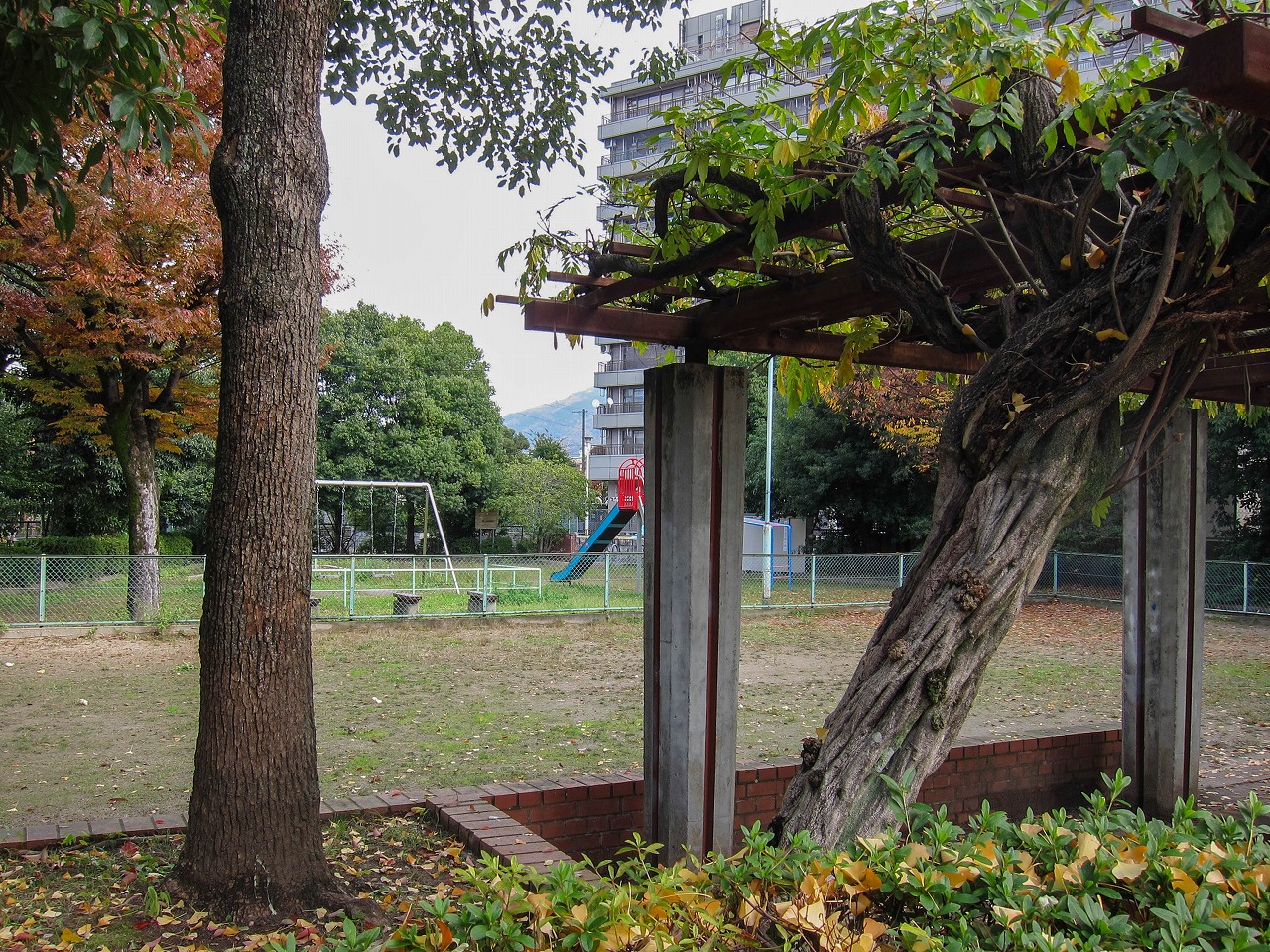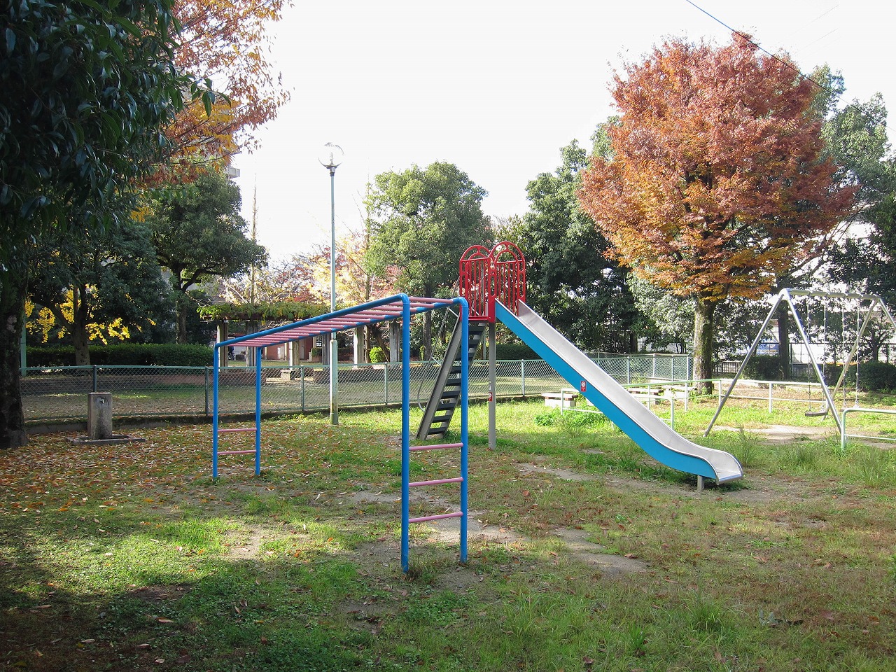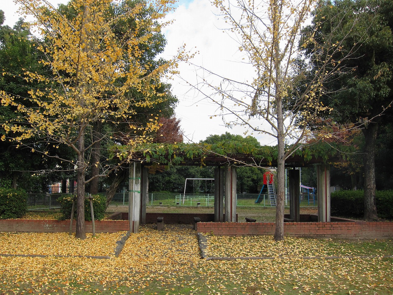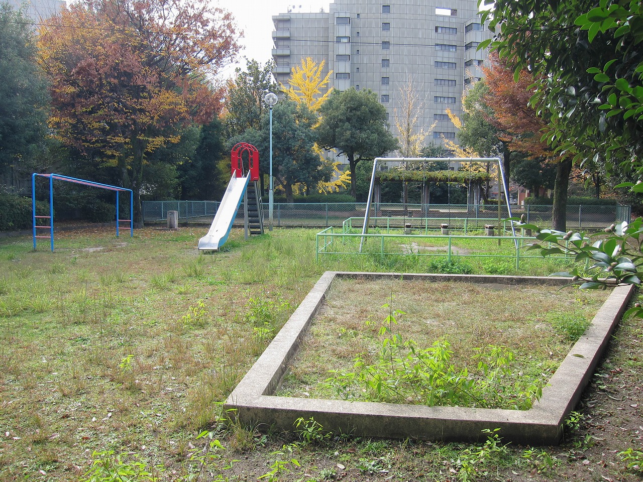 ![]() (2025年11月) 右手前は藤棚 北東方向 奥にブランコとすべり台 右奥は市営住宅13棟 |