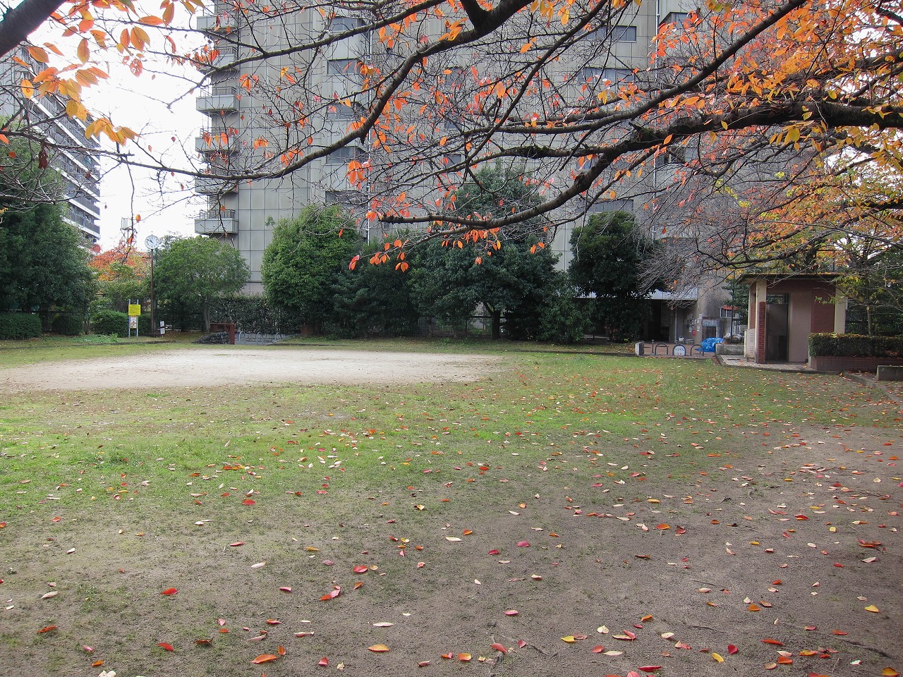 ![]() (2025年11月) 公園中央やや西から南の方向 右端はトイレ 奥は市営住宅12棟、左端は11棟 |