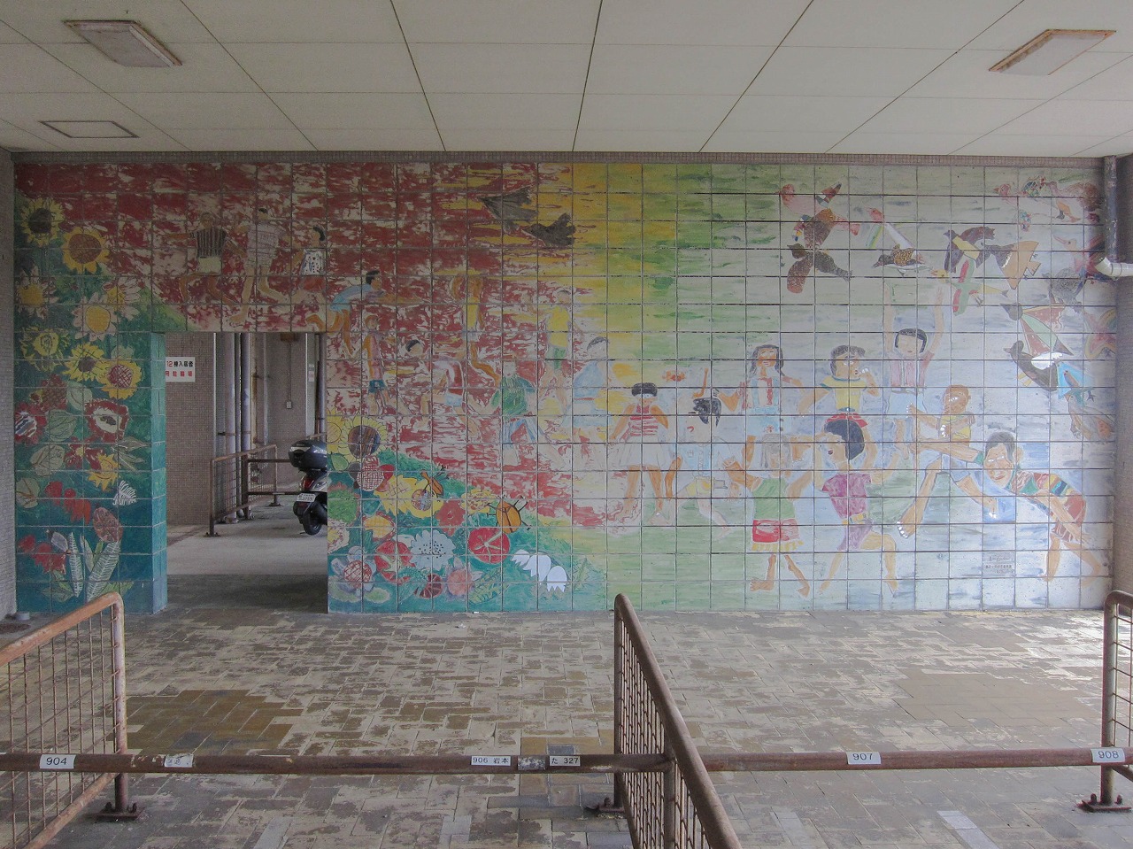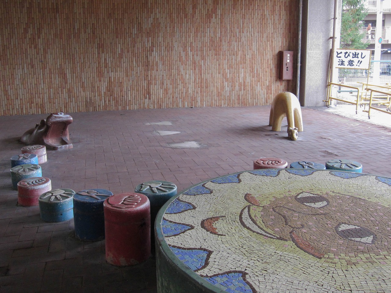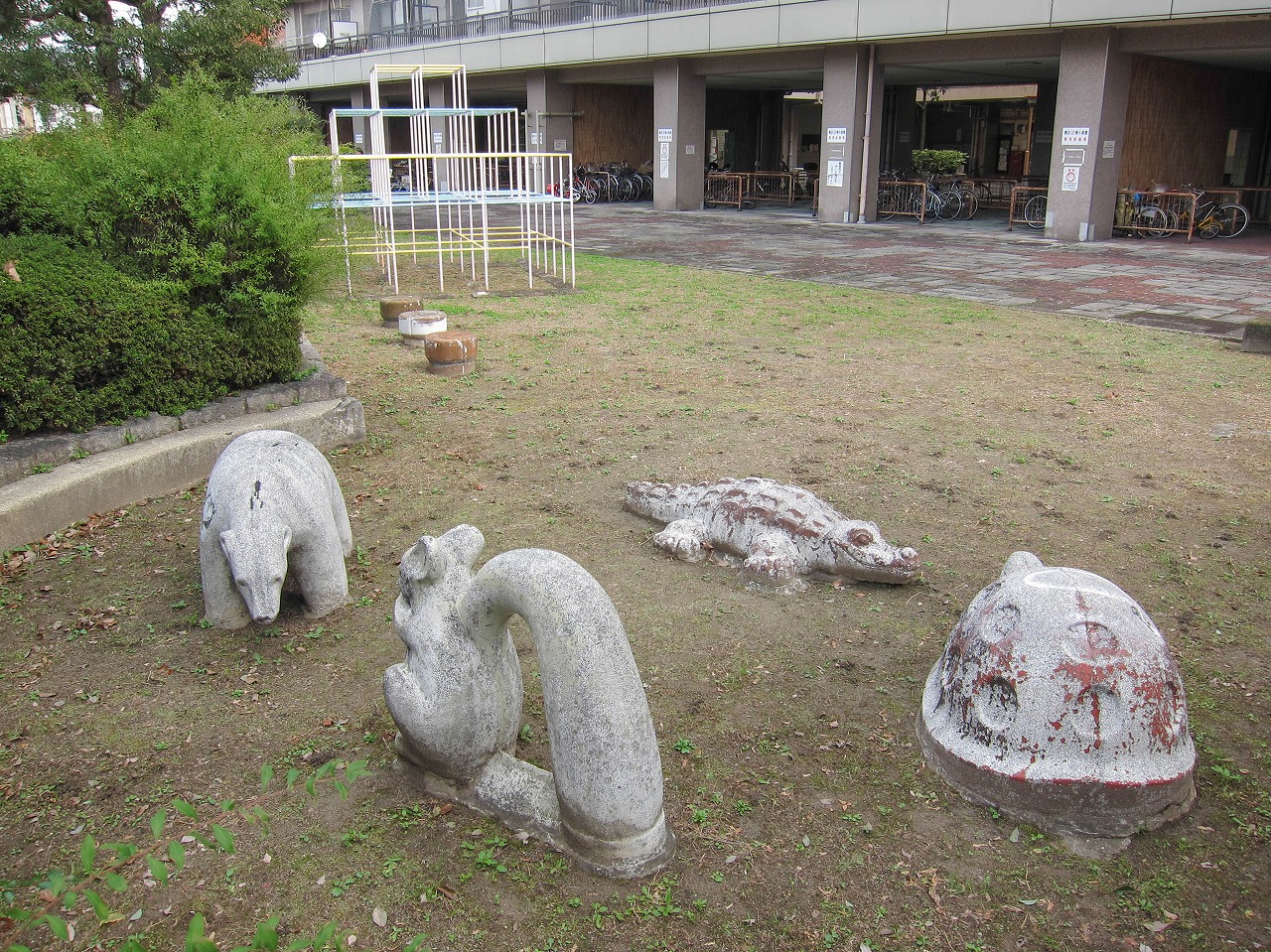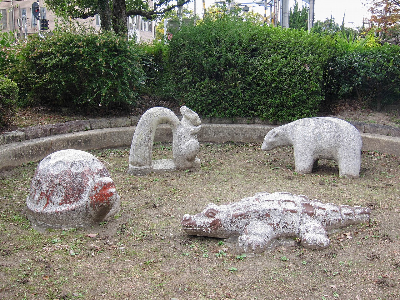 養正公園の南に位置する市営住宅で、京都市の資料によるとこの12棟は1976年度竣工です。東には11棟、北東には13棟、西には叡山電車の線路があります。 公園ではありませんが、普通の公園には2、3体しかいないような象形遊具の動物が12体もいます。建物内南西の1階部分ではカバとキリンがステップ遊具(19個のグーチョキパーのステップと、中心に大きな太陽の顔)のほうを向いています。カバは小松原公園、キリンは13棟や壬生檜公園にも同じ形のがいます。建物内南東の1階部分ではヒツジとウシとラクダが南向き、トラとライオンとシマウマが北向きで6体が向かい合っています。うち4体は13棟にもおり、ライオンは楽只公園、ラクダは馬場公園にもいます。建物の外の西側には、また別の4体がおり、そのうちクマは13棟にもいます。 市営住宅12棟と13棟の動物たちに触れていると、質感の違いがあることに気づきました。どちらも表面はつるつるして滑らか(ジャングルジム近くの4体はざらざら)なのですが、12棟のは軽くたたくと岩のように硬く重厚な感じがするのに対し、13棟のはプラスチックのようなあるいは中に空洞が含まれるかのようなやや軽めの音がするのです。全てがそうなのかは不明ですが、何体かずつ試したところその違いがありました。塗装による差もあるかもしれませんが、表面の傷のつき方もやや違うので、あまり鮮明ではありませんが参考程度に写真で比較してみます。 左は13棟、右は12棟のラクダ 左は13棟、右は12棟のウシ壁画は2枚、11棟と13棟にも2枚ずつで合計6枚あります。12棟のものは壁画の題名とともに「養正小学校児童原画 1975」と記されており、このマンションとほぼ同時期に作られたことがわかります。 キリンとカバの間には、過去には何か設置されていたような跡があります。それ以外は概ね当初から現在のような姿だったのではないかと思われますが、詳細は不明です。そしてこの12棟自体は、2021年の京都市「養正市営住宅団地再生計画」によると、2029~2030年度に除却(取り壊し?)の予定になっています。