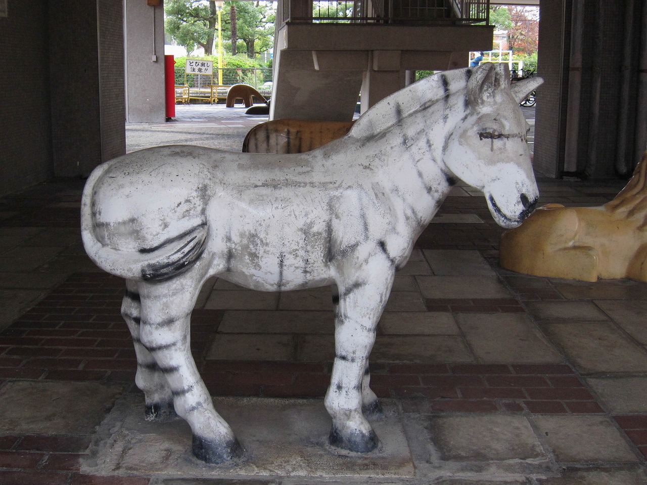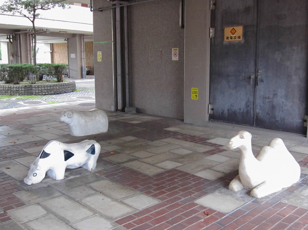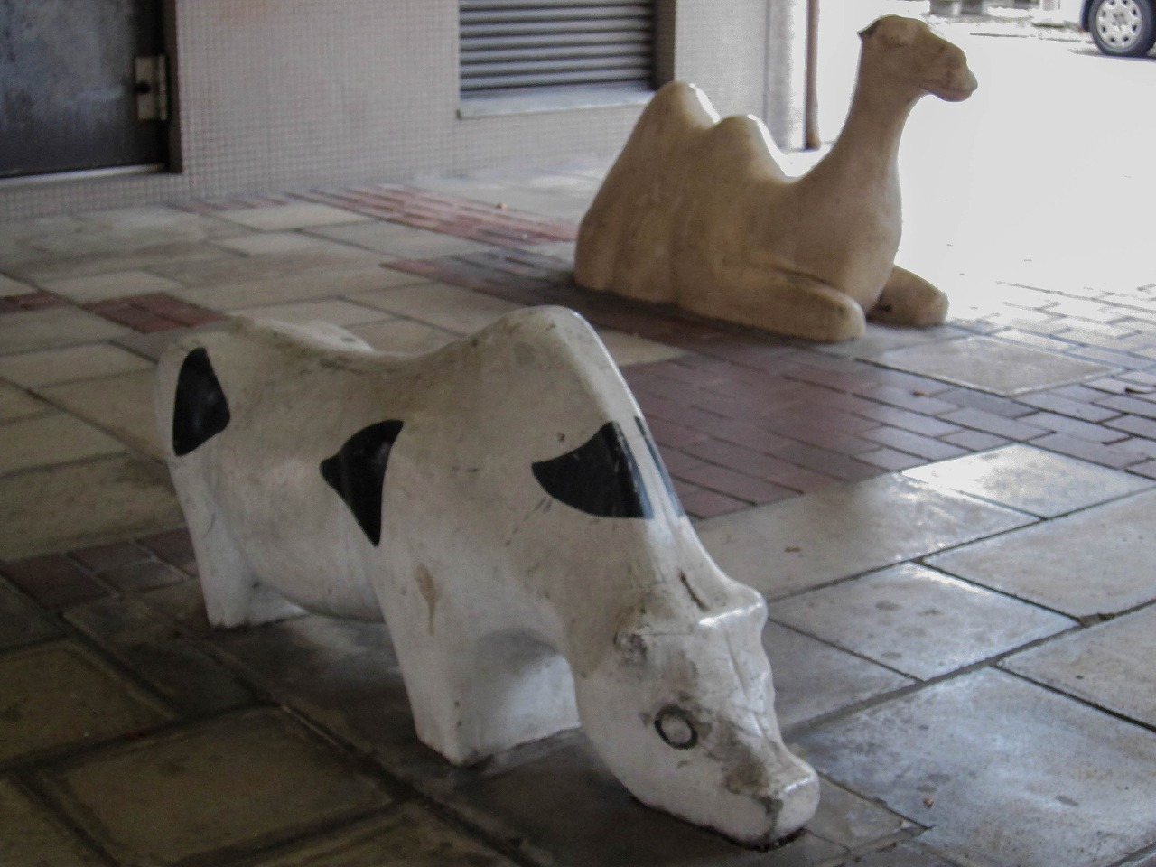 養正公園の南に位置する市営住宅で、京都市の資料によるとこの12棟は1976年度竣工です。東には11棟、北東には13棟、西には叡山電車の線路があります。 公園ではありませんが、普通の公園には2、3体しかいないような象形遊具の動物が12体もいます。建物内南西の1階部分ではカバとキリンがステップ遊具(19個のグーチョキパーのステップと、中心に大きな太陽の顔)のほうを向いています。カバは小松原公園、キリンは13棟や壬生檜公園にも同じ形のがいます。建物内南東の1階部分ではヒツジとウシとラクダが南向き、トラとライオンとシマウマが北向きで6体が向かい合っています。うち4体は13棟にもおり、ライオンは楽只公園、ラクダは馬場公園にもいます。建物の外の西側には、また別の4体がおり、そのうちクマは13棟にもいます。 市営住宅12棟と13棟の動物たちに触れていると、質感の違いがあることに気づきました。どちらも表面はつるつるして滑らか(ジャングルジム近くの4体はざらざら)なのですが、12棟のは軽くたたくと岩のように硬く重厚な感じがするのに対し、13棟のはプラスチックのようなあるいは中に空洞が含まれるかのようなやや軽めの音がするのです。全てがそうなのかは不明ですが、何体かずつ試したところその違いがありました。塗装による差もあるかもしれませんが、表面の傷のつき方もやや違うので、あまり鮮明ではありませんが参考程度に写真で比較してみます。 左は13棟、右は12棟のラクダ 左は13棟、右は12棟のウシ壁画は2枚、11棟と13棟にも2枚ずつで合計6枚あります。12棟のものは壁画の題名とともに「養正小学校児童原画 1975」と記されており、このマンションとほぼ同時期に作られたことがわかります。 キリンとカバの間には、過去には何か設置されていたような跡があります。それ以外は概ね当初から現在のような姿だったのではないかと思われますが、詳細は不明です。そしてこの12棟自体は、2021年の京都市「養正市営住宅団地再生計画」によると、2029~2030年度に除却(取り壊し?)の予定になっています。
