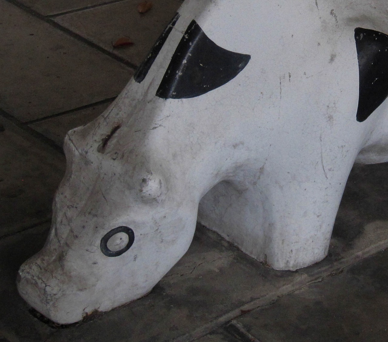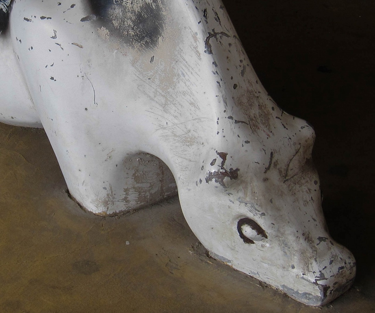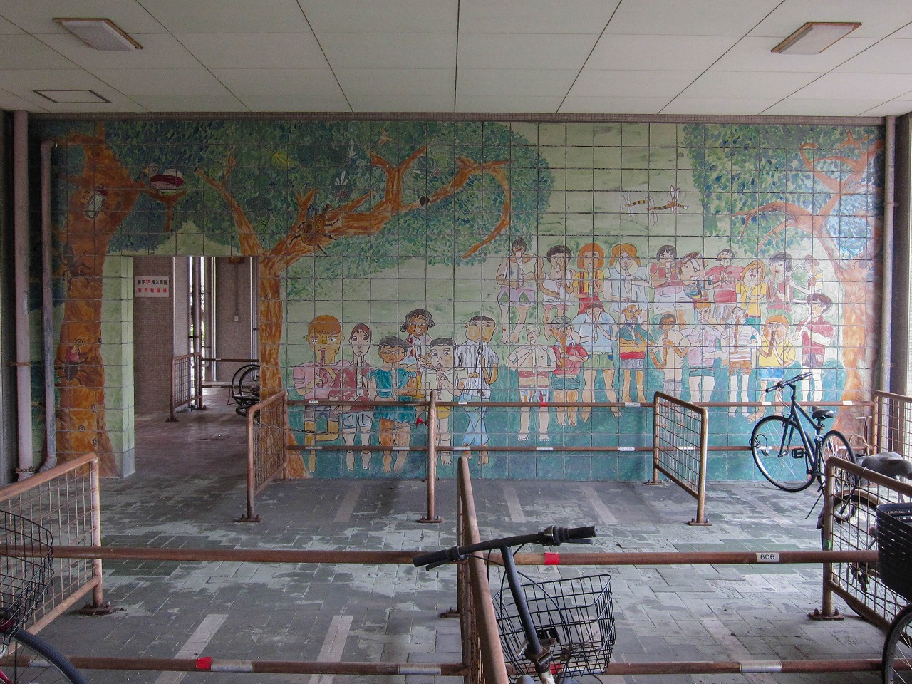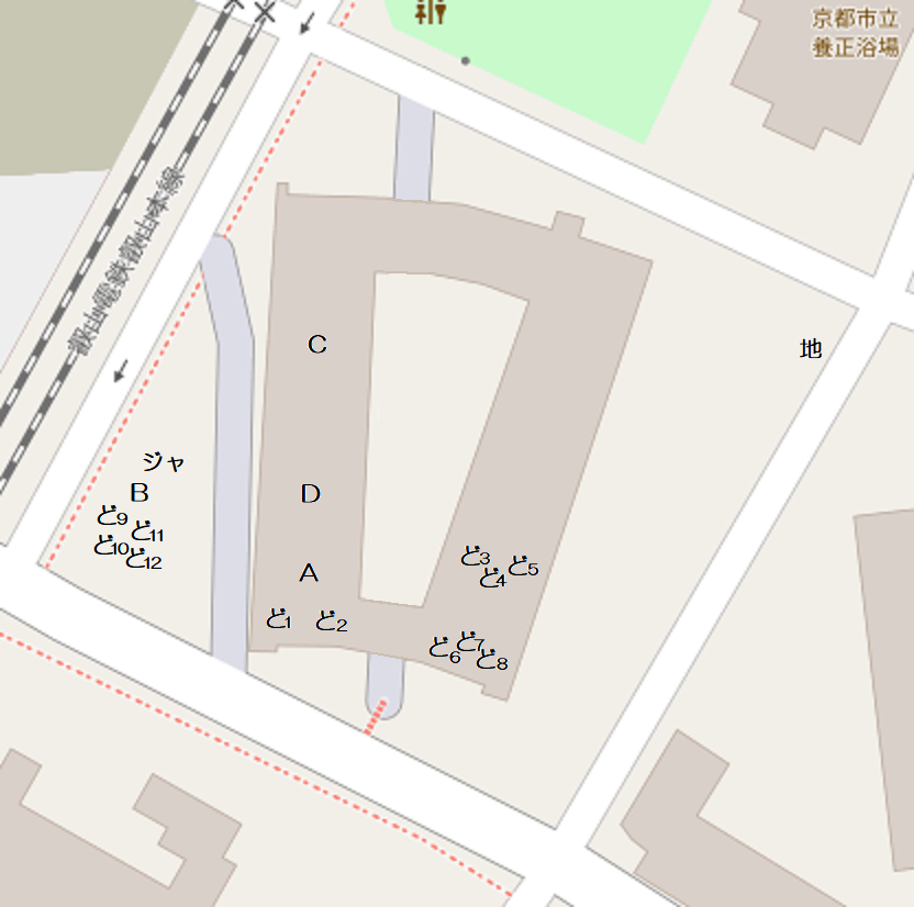 養正公園の南に位置する市営住宅で、京都市の資料によるとこの12棟は1976年度竣工です。東には11棟、北東には13棟、西には叡山電車の線路があります。 公園ではありませんが、普通の公園には2、3体しかいないような象形遊具の動物が12体もいます。建物内南西の1階部分ではカバとキリンがステップ遊具(19個のグーチョキパーのステップと、中心に大きな太陽の顔)のほうを向いています。カバは小松原公園、キリンは13棟や壬生檜公園にも同じ形のがいます。建物内南東の1階部分ではヒツジとウシとラクダが南向き、トラとライオンとシマウマが北向きで6体が向かい合っています。うち4体は13棟にもおり、ライオンは楽只公園、ラクダは馬場公園にもいます。建物の外の西側には、また別の4体がおり、そのうちクマは13棟にもいます。 市営住宅12棟と13棟の動物たちに触れていると、質感の違いがあることに気づきました。どちらも表面はつるつるして滑らか(ジャングルジム近くの4体はざらざら)なのですが、12棟のは軽くたたくと岩のように硬く重厚な感じがするのに対し、13棟のはプラスチックのようなあるいは中に空洞が含まれるかのようなやや軽めの音がするのです。全てがそうなのかは不明ですが、何体かずつ試したところその違いがありました。塗装による差もあるかもしれませんが、表面の傷のつき方もやや違うので、あまり鮮明ではありませんが参考程度に写真で比較してみます。 左は13棟、右は12棟のラクダ 左は13棟、右は12棟のウシ壁画は2枚、11棟と13棟にも2枚ずつで合計6枚あります。12棟のものは壁画の題名とともに「養正小学校児童原画 1975」と記されており、このマンションとほぼ同時期に作られたことがわかります。 キリンとカバの間には、過去には何か設置されていたような跡があります。それ以外は概ね当初から現在のような姿だったのではないかと思われますが、詳細は不明です。そしてこの12棟自体は、2021年の京都市「養正市営住宅団地再生計画」によると、2029~2030年度に除却(取り壊し?)の予定になっています。