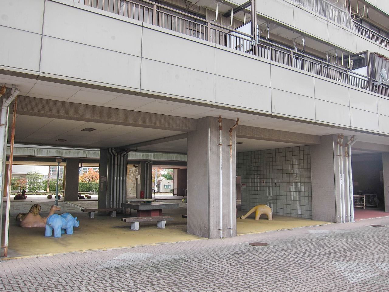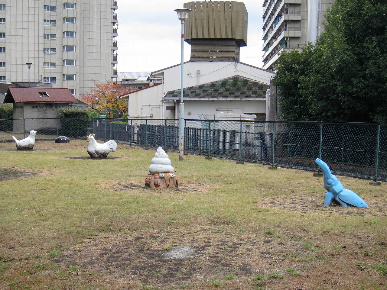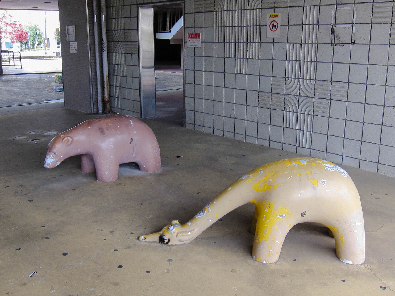 養正公園の東に位置する市営住宅で、京都市の資料によるとこの13棟は1981年度竣工です。南には11棟、南西には12棟、北には叡山電車の線路があります。 公園ではありませんが、普通の公園には2、3体しかいないような象形遊具の動物が15体もいます。建物内南西の1階部分では壁画「きぼう」の前でサイとラクダとライオンが南向き、キリンとクマが北向きで5体が向かい合っています。うち4体は12棟にもいます。建物内南東の1階部分では壁画「なかま」の前でウマとブタが南向き、ヒツジとウシとウサギが北向きで5体がステップ遊具をはさんで向かい合っています。ヒツジとウシは12棟にもおり、ウサギは三条坊町公園にもいます。ブタは壬生檜公園、ウマは西の京公園などでも見かけます。建物の外の西側にはまた別の5体がおり、鳥や昆虫など小さめの生き物たちです。 中庭のステップ遊具(左の写真)は12棟のカバの前にあるものと同じでグーチョキパーのステップの集まりです。東のテーブルの周囲のもの(右の写真)もステップ遊具としましたがこちらはイスに近いともいえ、京都では菖蒲園公園や南田公園など、これに似たものを時折見かけます。 ![]() 壁画は2枚、11棟と12棟にも2枚ずつで合計6枚あります。13棟のものは壁画の題名とともに「養正小学校児童原画 1980」と記されており、このマンションとほぼ同時期に作られたことがわかります。 この13棟の敷地内では、クワガタやヤドカリらのいる西のエリアが最も新しく、1987~1995年の間に現在の姿になりました。ただしクワガタの北東に何か設置されていたような跡があるため、当初はもう1体いたのかもしれません。クマの横やブタの横にも何かいたような跡がありますが、こちらも詳細は不明です。それ以外は概ね当初から現在のような姿だったのではないかと思われます。そしてこの13棟自体は、2021年の京都市「養正市営住宅団地再生計画」によると、2025~2026年度に除却(取り壊し?)の予定になっています。