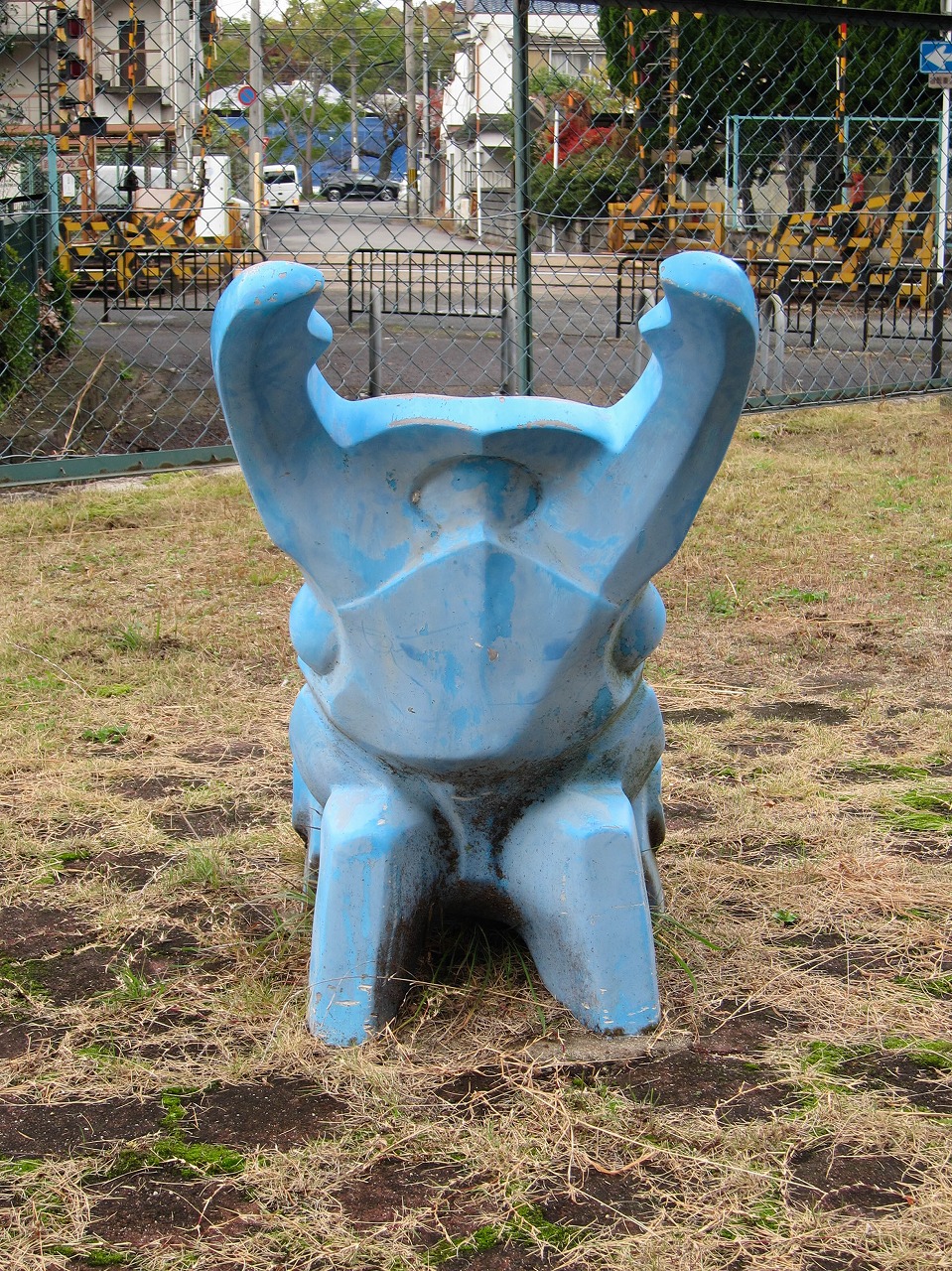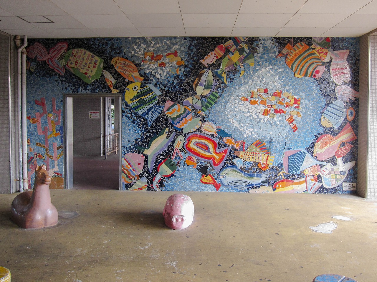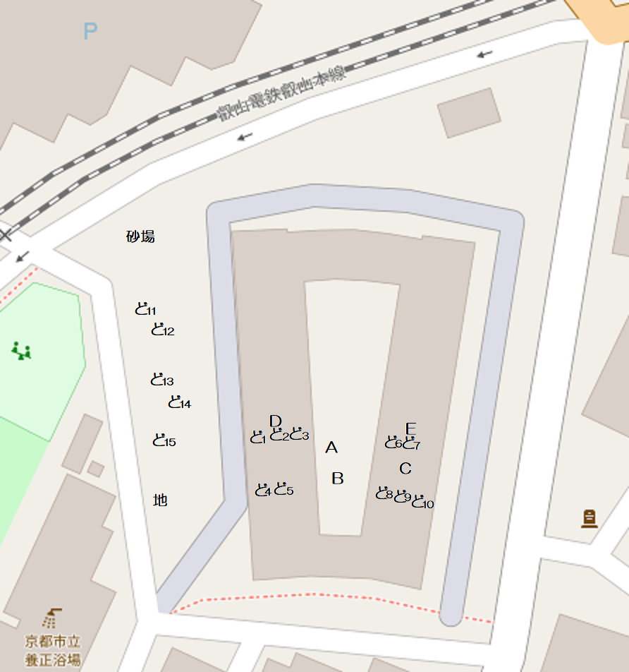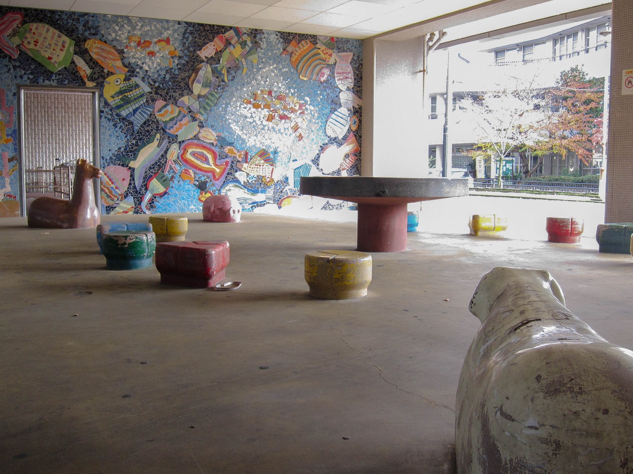 養正公園の東に位置する市営住宅で、京都市の資料によるとこの13棟は1981年度竣工です。南には11棟、南西には12棟、北には叡山電車の線路があります。 公園ではありませんが、普通の公園には2、3体しかいないような象形遊具の動物が15体もいます。建物内南西の1階部分では壁画「きぼう」の前でサイとラクダとライオンが南向き、キリンとクマが北向きで5体が向かい合っています。うち4体は12棟にもいます。建物内南東の1階部分では壁画「なかま」の前でウマとブタが南向き、ヒツジとウシとウサギが北向きで5体がステップ遊具をはさんで向かい合っています。ヒツジとウシは12棟にもおり、ウサギは三条坊町公園にもいます。ブタは壬生檜公園、ウマは西の京公園などでも見かけます。建物の外の西側にはまた別の5体がおり、鳥や昆虫など小さめの生き物たちです。 中庭のステップ遊具(左の写真)は12棟のカバの前にあるものと同じでグーチョキパーのステップの集まりです。東のテーブルの周囲のもの(右の写真)もステップ遊具としましたがこちらはイスに近いともいえ、京都では菖蒲園公園や南田公園など、これに似たものを時折見かけます。 ![]() 壁画は2枚、11棟と12棟にも2枚ずつで合計6枚あります。13棟のものは壁画の題名とともに「養正小学校児童原画 1980」と記されており、このマンションとほぼ同時期に作られたことがわかります。 この13棟の敷地内では、クワガタやヤドカリらのいる西のエリアが最も新しく、1987~1995年の間に現在の姿になりました。ただしクワガタの北東に何か設置されていたような跡があるため、当初はもう1体いたのかもしれません。クマの横やブタの横にも何かいたような跡がありますが、こちらも詳細は不明です。それ以外は概ね当初から現在のような姿だったのではないかと思われます。そしてこの13棟自体は、2021年の京都市「養正市営住宅団地再生計画」によると、2025~2026年度に除却(取り壊し?)の予定になっています。