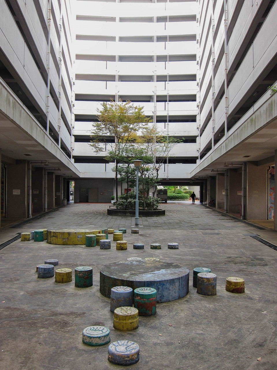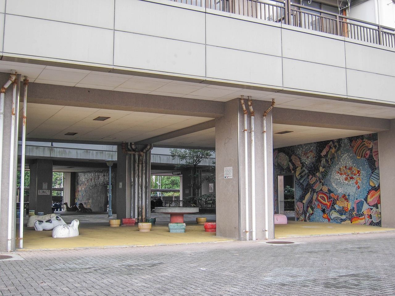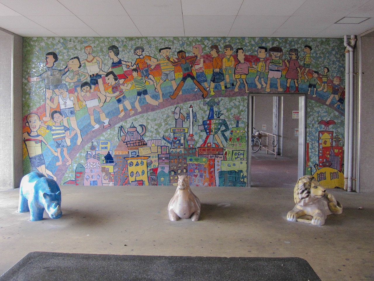 ![]() (2025年11月) 13棟東側から北西方向 右に壁画「なかま」 左にウサギやウシ、左奥にライオンやラクダも見える |