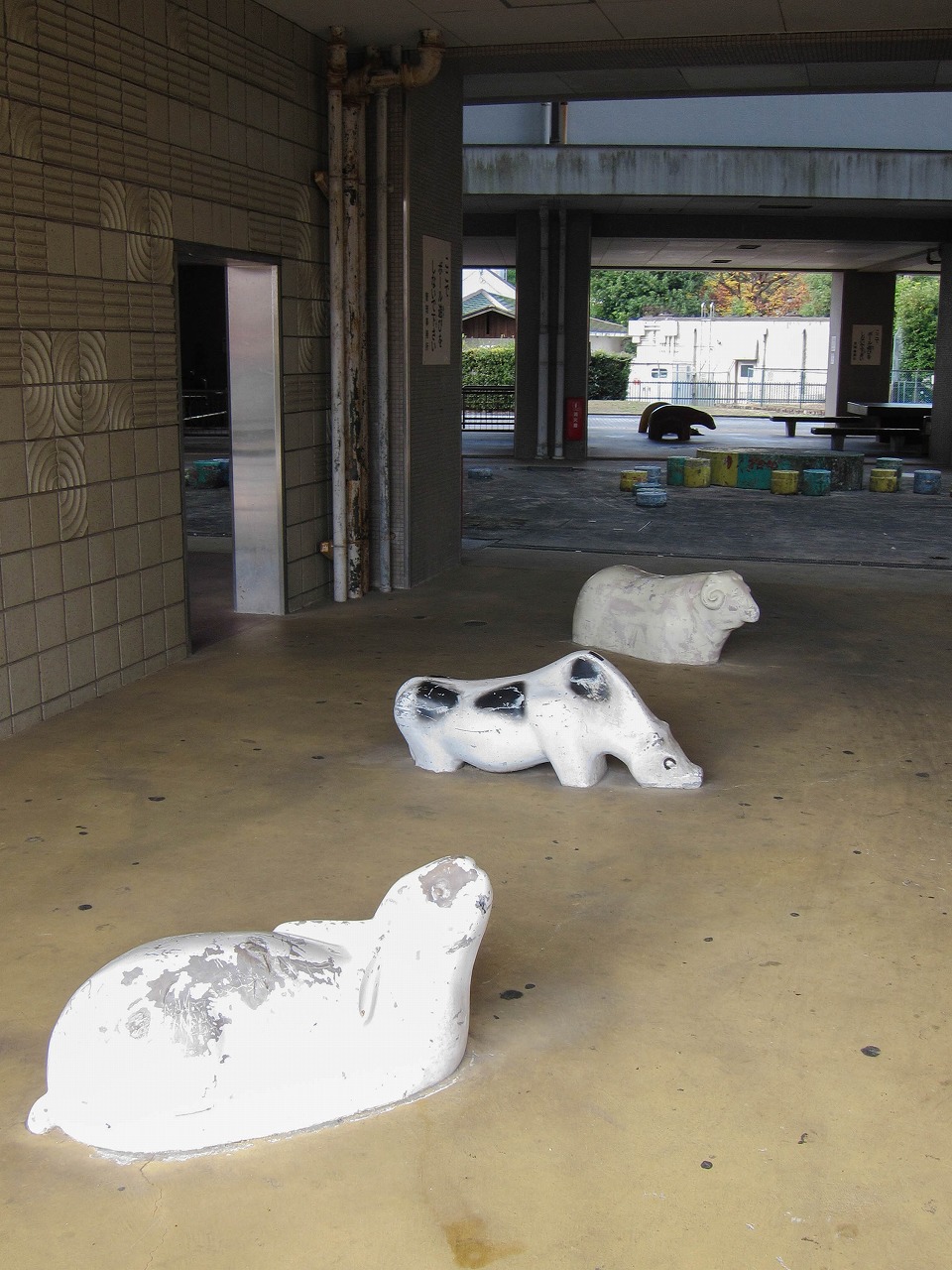 ![]() (2025年11月) 手前からウサギ、ウシ、ヒツジ 西の方向 中庭のステップ遊具の奥にクマも見える |