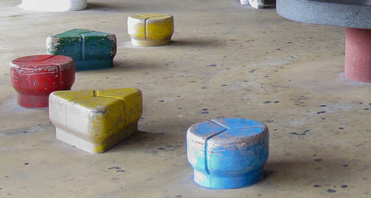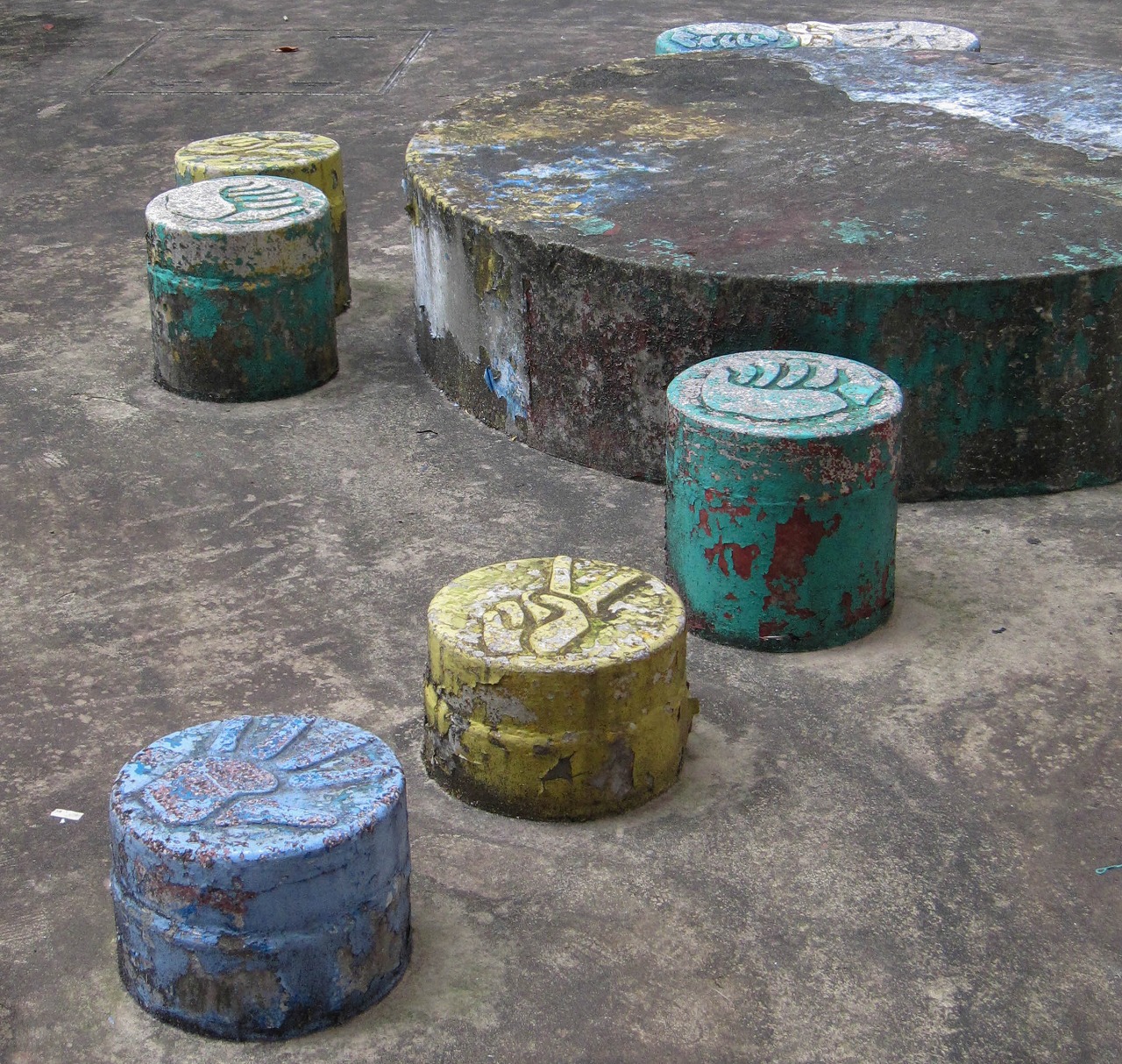 2025年11月現在の配置 ど1…動物の象形遊具(サイ) ど2…動物の象形遊具(ラクダ) ど3…動物の象形遊具(ライオン) ど4…動物の象形遊具(キリン) ど5…動物の象形遊具(クマ) ど6…動物の象形遊具(ウマ) ど7…動物の象形遊具(ブタ) ど8…動物の象形遊具(ヒツジ) ど9…動物の象形遊具(ウシ) ど10…動物の象形遊具(ウサギ) ど11…動物の象形遊具(クワガタ) ど12…動物の象形遊具(ヤドカリ) ど13…動物の象形遊具(ニワトリ) ど14…動物の象形遊具(ハト) ど15…動物の象形遊具(テントウムシ) A…ステップ遊具(20個)※中央の大きい円を含めた数 B…ステップ遊具(16個)※中央の大きい円を含めた数 C…ステップ遊具(10個)※中央のテーブルを含めず D…壁画「きぼう」 E…壁画「なかま」 砂場 地…地蔵堂 |