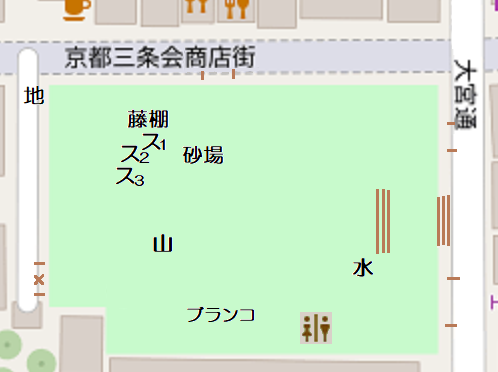 公園名のとおり三条通と大宮通の角にある、商店街沿いの公園です。人の出入りが多くにぎやかな環境です。 スプリング遊具は藤棚の南の木の周りに配置されています。先頭はネコ、次にラッコ、次にウマが、(上から見ると時計回りに向かって)追いかけているように見えます。以前はネコの前(ネコの南東)にもう1体のウマがいましたが、2022~2025年の間にいなくなりました。 かつて北西の隅にちびっこプール(1975年度開設)がありましたが、2008年頃までになくなりました。砂場の周囲には2018~2020年頃に柵が設けられました。また、南西には妙泉寺の通路に通じる出入口がありますが、現在は立入禁止と表示されています。 藤棚の柱に、公園の工事に関する通知が掲示されていました。2025年10月~2026年1月の間に、老朽化しているスプリング遊具をスイング遊具(ロッキング遊具)に入れ替えるとのことです。撤去対象のスプリング遊具は全部なのか一部なのか、あるいは既に無い1体のことなのかは不明です。