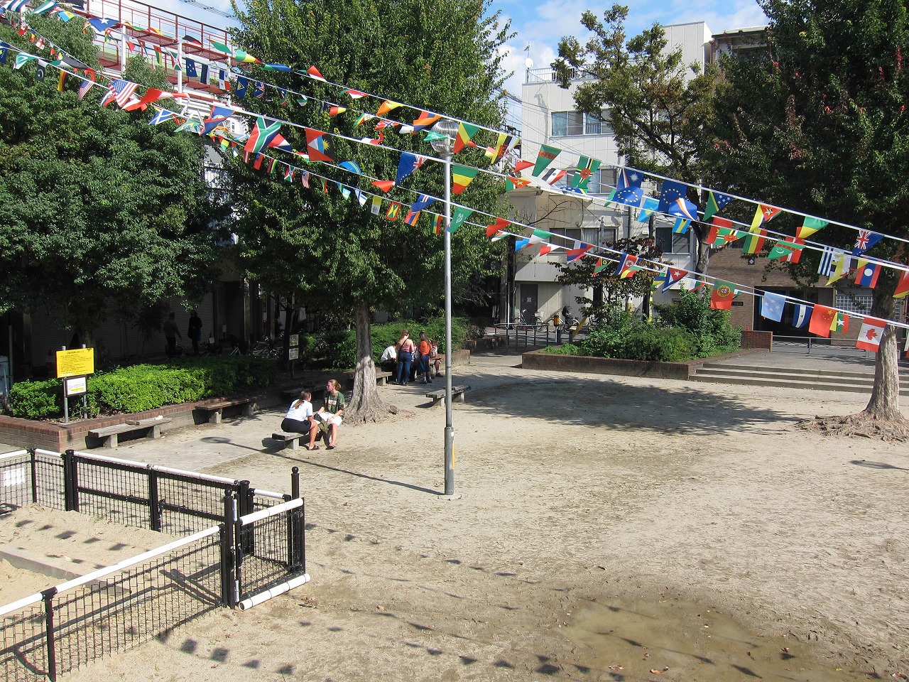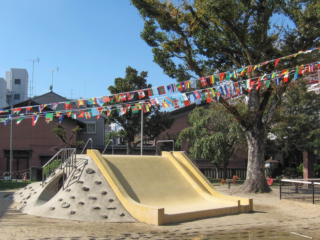 ![]() (2025年10月) 山型遊具の上から北東方向 左は柵に囲まれた砂場 |