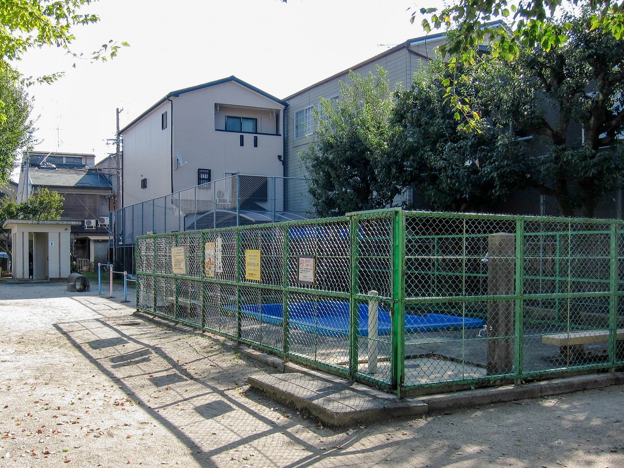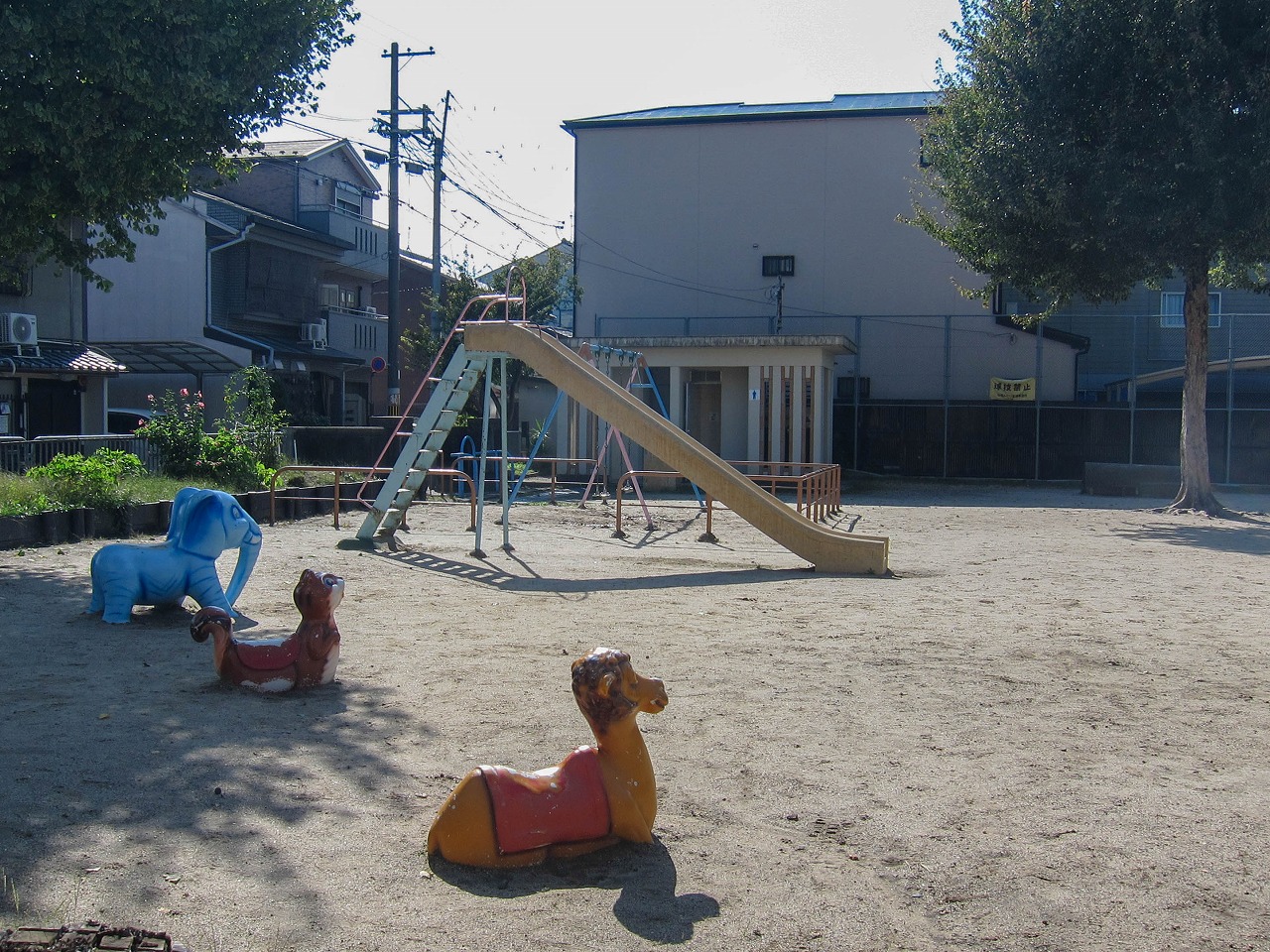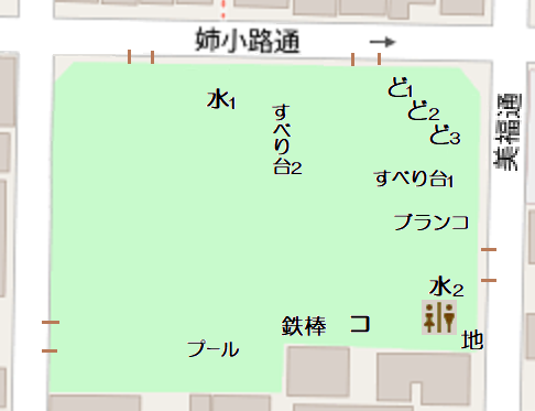 2025年10月現在の配置 すべり台1(コンクリート製) すべり台2(コンクリート製・幅広・小) ブランコ(2連) 鉄棒(3連) ど1…動物の象形遊具(ラクダ) ど2…動物の象形遊具(リス) ど3…動物の象形遊具(ゾウ) コ…コンクリート製遊具(トンネル) プール(ちびっこプール) 地…地蔵堂 水1…水栓柱 水2…手洗い場 |