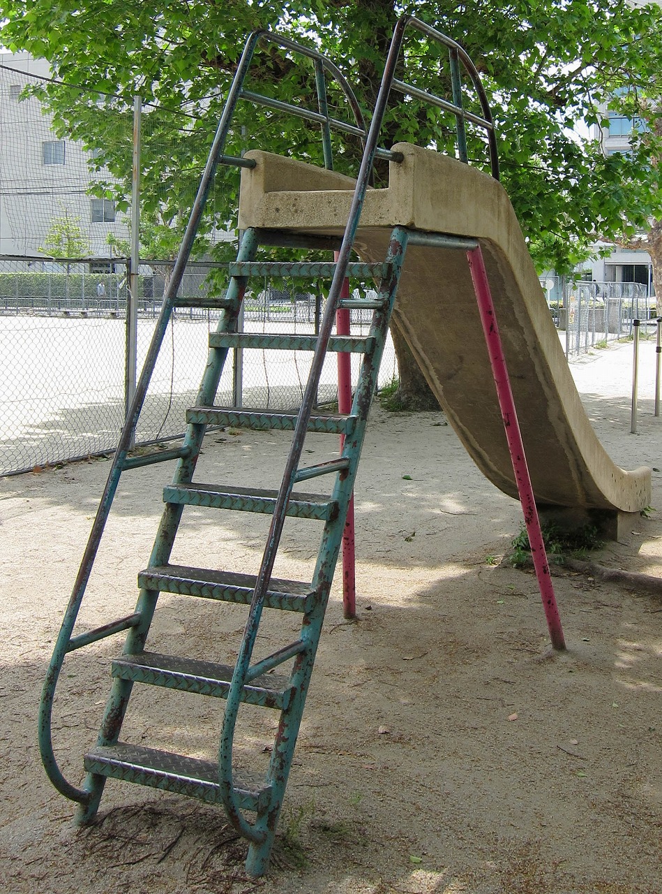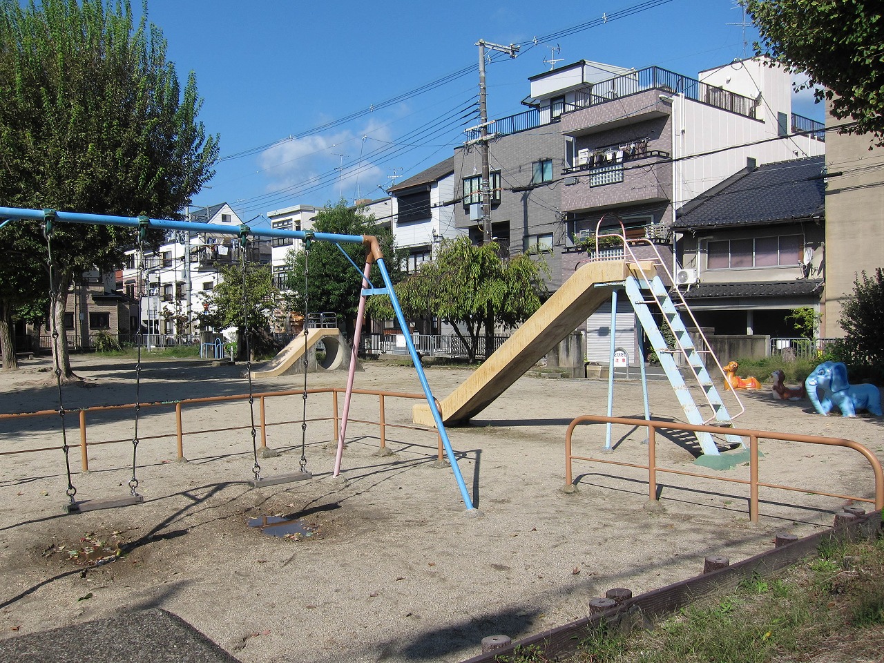 1950年設置の公園です。北側の姉小路通と、西側の坊城通、東側の美福通に囲まれています。この西の通りを坊城通に含めない見解もあるようですが、公園名は「姉小路と坊城の角なので姉坊城」との認識で、まあ間違いではないでしょう。 動物の象形遊具は、ラクダ、リス、ゾウの3体。ラクダは南田公園や菖蒲園公園などと違い、頭と頬がヒツジのようにでこぼこしています。ゾウも馬場公園の鼻を上げたタイプではなく下がっています。リスもあまり見かけず、3体ともやや珍しいタイプなのかもしれません。 ちびっこプール(1974年度開設)は春栄公園のものと同様、設備がひととおり残っている貴重なものです。枠は他のちびっこプールと比べてやや濃い青色をしています。2025年の夏でもまだ使われていたようです。 すべり台は、金属の部分が他の公園のものと違うタイプになっています。左は姉坊城公園(2025年10月)、右は三条坊町公園(2025年5月)のすべり台です ![]() 右の三条坊町公園のものは西陣公園、烏帽子公園などとも同じ形で、京都の古くからのコンクリート製すべり台としては「標準型」といえるかと思います。これに対して姉坊城公園のものは、最上部の柵の形状が違う、はしごの踏み板の手前側が折れ曲がっておらず薄いシンプルな板状になっている、踏み板が多く9枚もある、といった違いがあります。「標準型」は踏み板は7枚、同じ形で6枚と少ない春栄公園のような例もあり。他には馬場公園のすべり台の金属部分はだいぶ違った形状をしています。 北のほうのすべり台(小)と水栓柱の間にはかつてスプリング遊具が2体(クジラとラッコ)いましたが、2022~2024年の間にいなくなりました。しかし公園外側に掲示してあった通知によると、2025年10月~2026年1月の間にスイング遊具(ロッキング遊具)を新設するとのことでした。ちょうどクジラとラッコがいたあたりに工事用の目印?があったので、そこに設置されるのかもしれません。