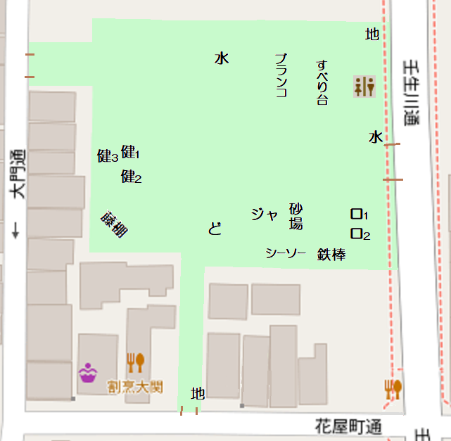 2025年11月現在の配置 すべり台(プラスチック製) シーソー ブランコ(2連) 鉄棒(2連) ジャ…ジャングルジム(小) ロ1…ロッキング遊具(ライオン) ロ2…ロッキング遊具(パンダ) ど…動物の象形遊具(ゾウ) 健1…健康遊具(ぶら下がり器) 健2…健康遊具(背伸ばしベンチ) 健3…健康遊具(腹筋ベンチ) 砂場 藤棚 地…地蔵堂×2 水…水栓柱×2 |