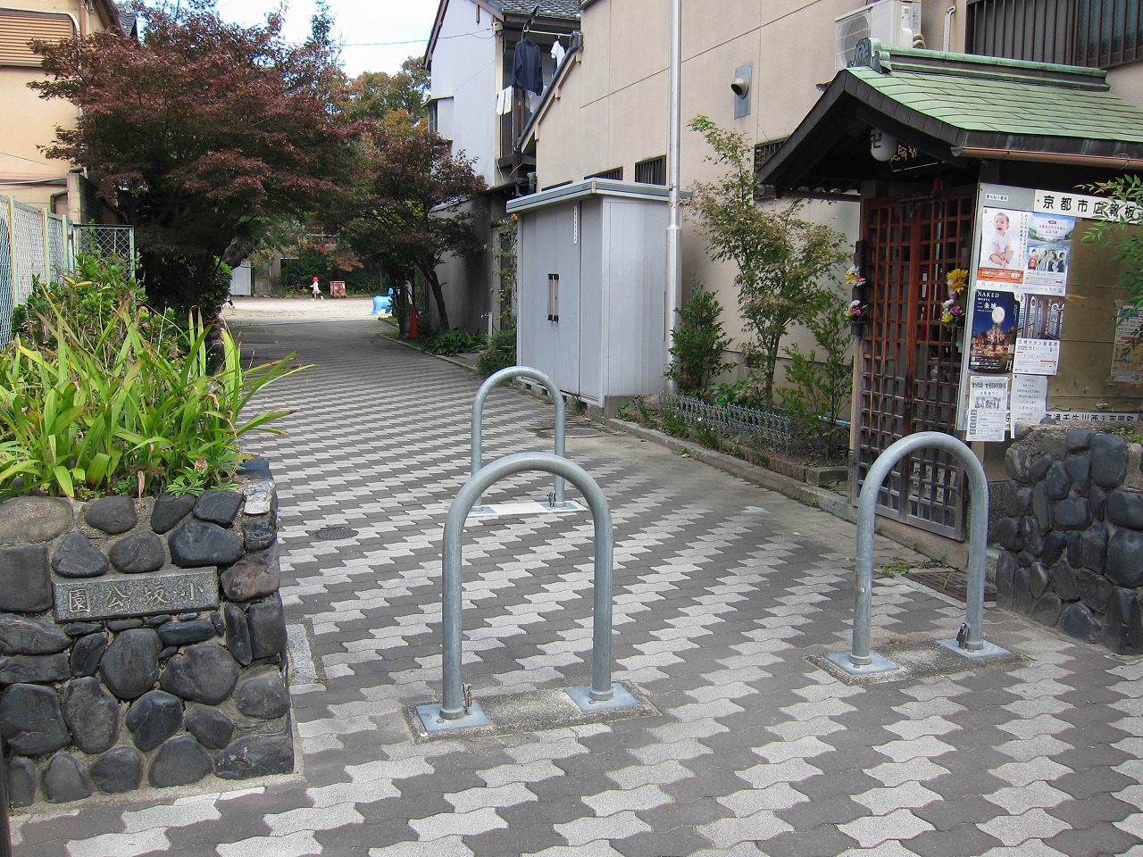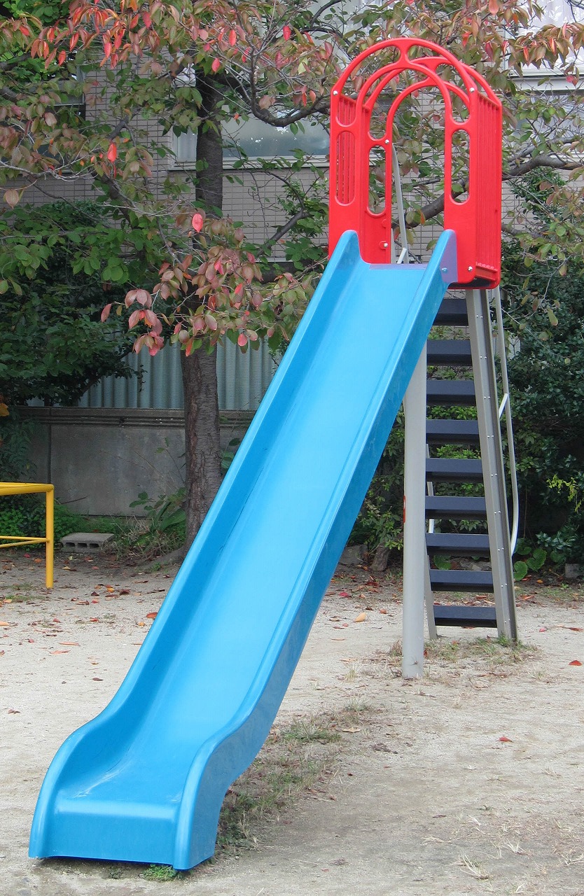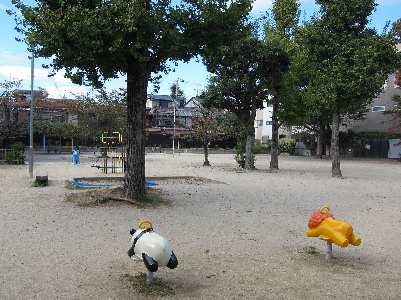 1939年設置と古いこの公園は壬生川通沿いにあり、小さい子ども向けの遊具が充実しています。東の他、南や西からも通路がつながっており、ほぼ正方形で開放感のある空間です。 京都の公園のすべり台の主流はコンクリート製から金属製のものに代わりつつありますが、ここのは少し違います。上の赤い柵や全体的な形は金属製のと同じですが、すべり面の色をよく見ると金属製の銀色ではなく、青くなっています。金属ではなくプラスチックで出来ているようです。2022~2024年頃設置された新しいもので耐久性の面は不明ですが、夏の高温でやけどするリスクは低めなのかもしれません。 ![]() かつて南西には大きな25mサイズのプールがありましたが1998~2003年頃に撤去され、その跡地が現在の藤棚や健康遊具のエリアになっています。北東にはちびっこプール(1974年度開設)がありましたが2014年頃に撤去され、跡地にトイレ(以前は北西にあった)が新しく建てられました。 ゾウの北隣にはスプリング遊具(ラッコ)がいましたが、2021~2022年の間にいなくなりました。すべり台はコンクリート製だったのが2022~2024年頃にプラスチック製に代わっています。2024~2025年頃には南東エリアでいくつかの変化あり、もう1組の2連ブランコがあったのがシーソーに代わり、ジャングルジムは大きいものから幼児向けの小さいものに、またロッキング遊具(ライオン、パンダ)が新しく加わりました。