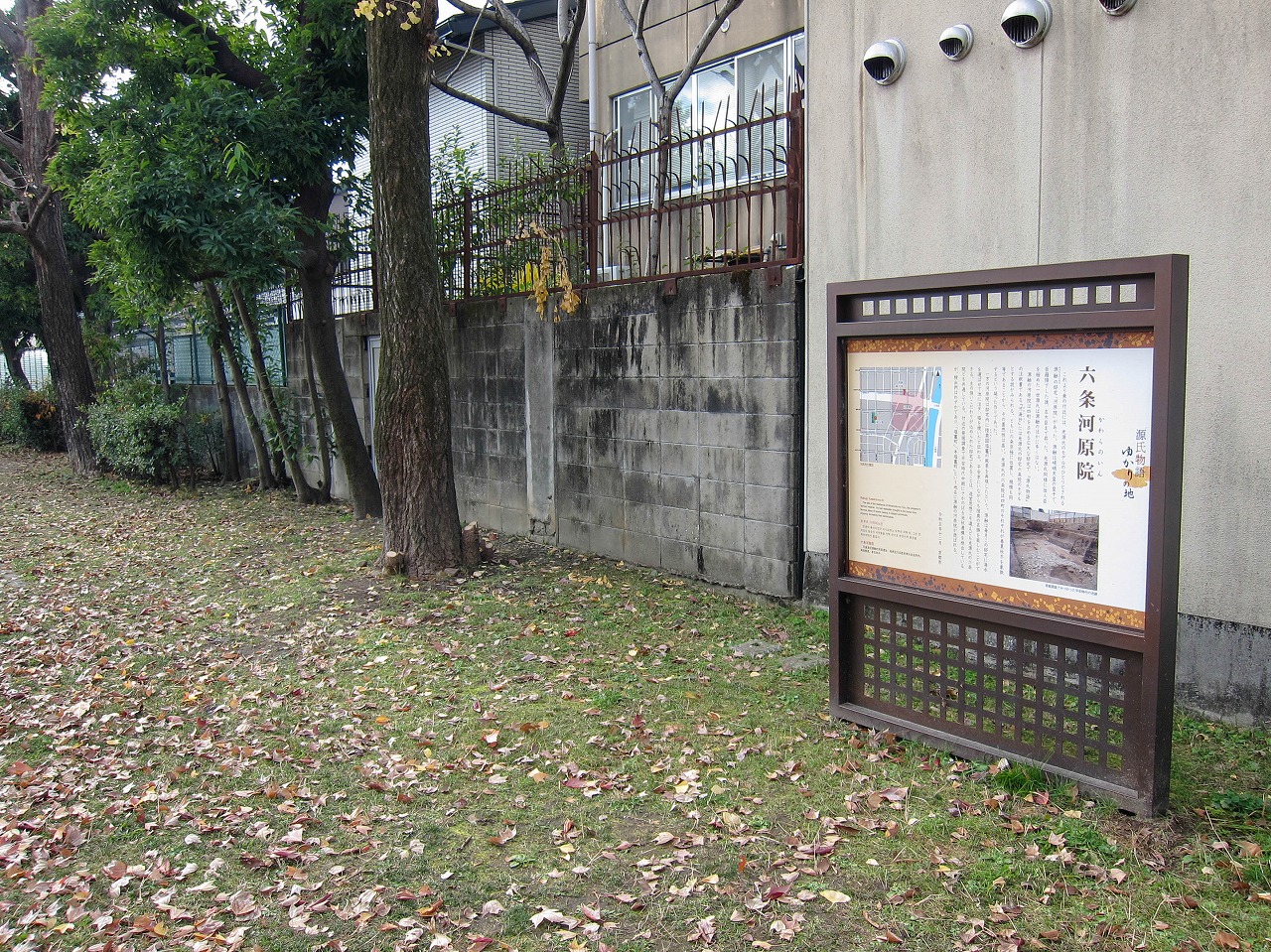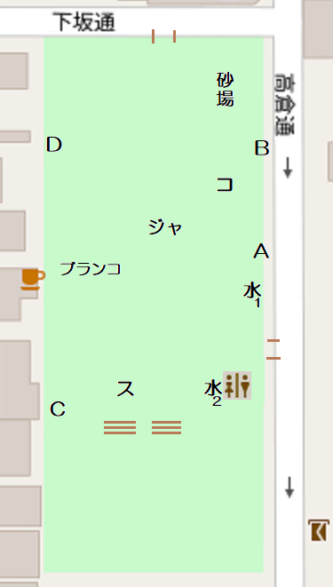 2025年12月現在の配置 ブランコ(2連) ジャ…ジャングルジム ス…スプリング遊具(ザギー) コ…コンクリート製遊具(トンネル) A…掲揚台 B…水道系?の設備 C…水道系?の設備 D…案内板「六条河原院」 砂場 水1…水栓柱 水2…手洗い場 |
