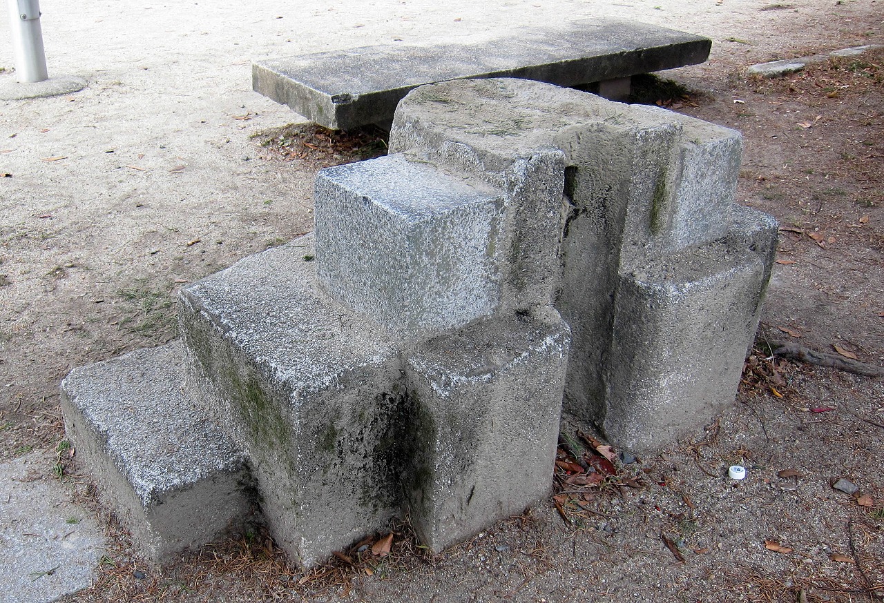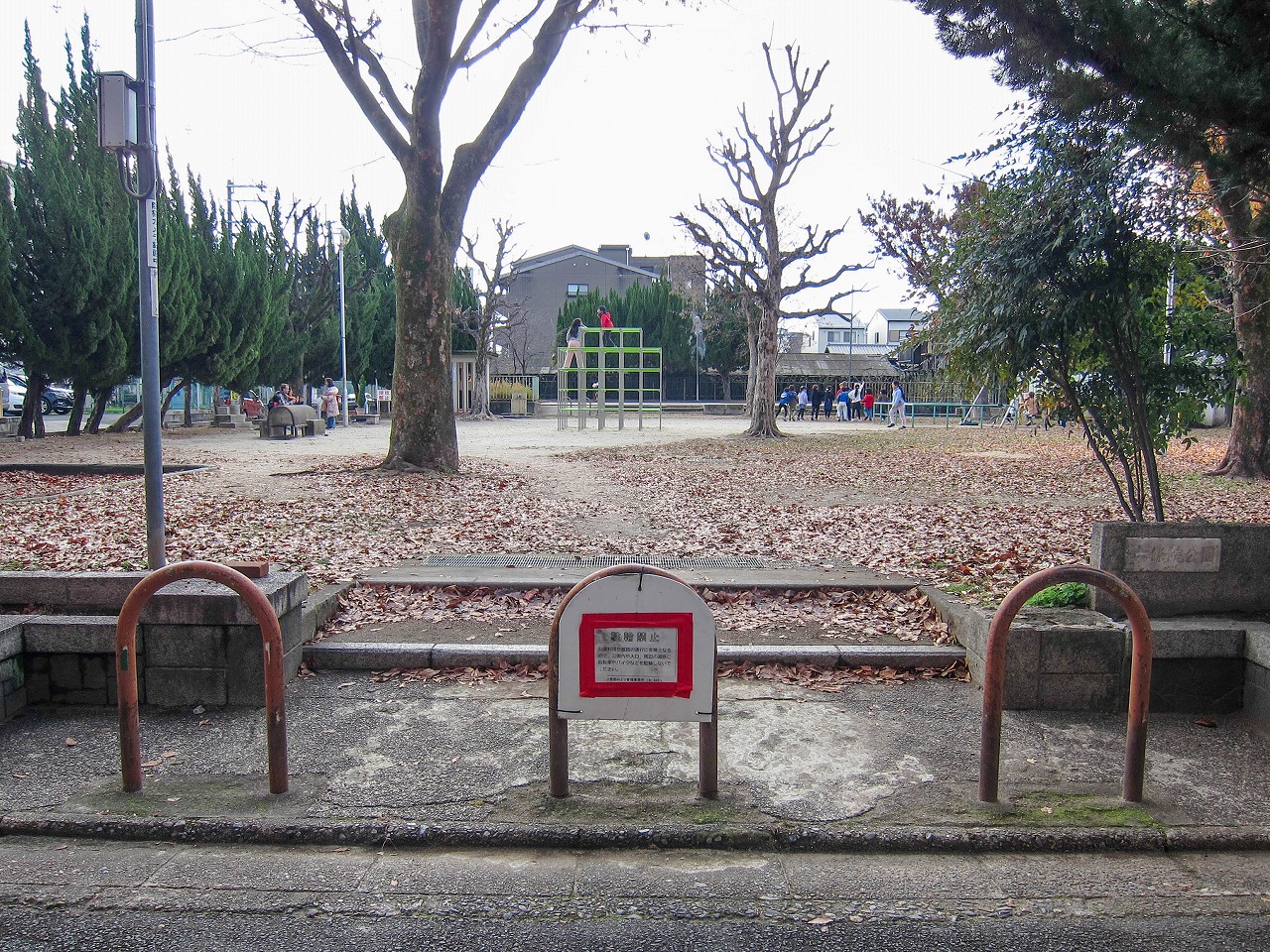 1942年設置と古く、下京区では唯一の「土木遺産」13公園のひとつです。南北に細長く、古いコンクリート構造物が多く残っています。 掲揚台の裏側にはくぼみがあり、そこに旗を立てるためのポールを設置する構造になっています。この点は西の京公園や下鴨森が前公園などのものと同様です。いずれも現在は掲揚台としては使われておらず、過去の遺構として、また子どもたちにとってはおそらく登ったり何か載せたりするものとして存在しているのでしょう。 ![]() コンクリート製のものとしては掲揚台の北に、またスプリング遊具の西にも、水を利用した可能性を思わせる構造物があります。他にも掲揚台付近などにある低くて広いベンチは、現代の新しい公園では見かけないものです。トンネル遊具は紫野柳公園、春栄公園、姉坊城公園にも同じものがあります。 スプリング遊具や象形遊具は何の動物なのかわかりにくいものが稀にいますが、ここのスプリング遊具もそのひとつです。デンマークのKOMPAN社のものらしく、海外では「Zaggy」の名で紹介されており、日本の2015年版のカタログにも「ザギー」「未知の生物」などと記載があります。しっぽ?の右側に「2013」との表記あり。2013~2015年の間にこの公園に設置されました。 ![]() 公園の南の3分の1弱ほどのエリアは階段で少し高く、現在は何もありませんが、ここにはかつて25mサイズのプールがありました。1960~70年代頃には地元の稚松、菊浜、崇仁、有隣、永松の各小学校が使用していたようです。そのプールの東の端では、使われなくなった京都市電が2000年頃まで置かれていました。また階段を降りてすぐ北、トイレと水道系?の設備Cの間にはちびっこプール(1975年度開設)がありましたが、2013~2015年の間に撤去され、跡地にスプリング遊具が置かれました。公園の中央やや東にはかつて、横から見ると平面、上から見ると逆S字の形をしたジャングルジムのような遊具がありましたが、2020~2022年の間に現在の立方体に近いジャングルジムに代わりました。